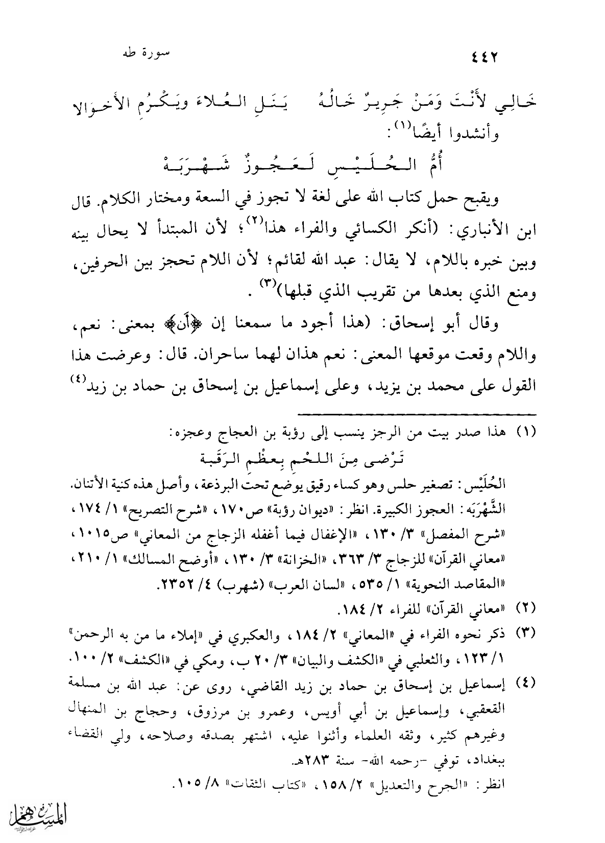 ويقبح حمل كتاب الله على لغة لا تجوز في السعة ومختار الكلام. قال ابن الأنباري: (أنكر الكسائي والفراء هذا (¬2)؛ لأن المبتدأ لا يحال بينه وبين خبره باللام، لا يقال: عبد الله لقائم؛ لأنّ اللام تحجز بين الحرفين، ومنع الذي بعدها من تقريب الذي قبلها) (¬3).