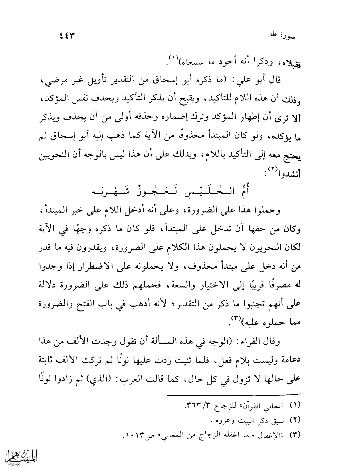 قال أبو علي: (ما ذكره أبو إسحاق من التقدير تأويل غير مرضي، وذلك أن هذه اللام للتأكيد، ويقبح أن يذكر التأكيد ويحذف نفس المؤكد، ألا ترى أن إظهار المؤكد وترك إضماره وحذفه أولى من أن يحذف ويذكر ما يؤكده، ولو كان المبتدأ محذوفًا من الآية كما ذهب إليه أبو إسحاق لم يحتج معه إلى التأكيد باللام، ويدلك على أن هذا ليس بالوجه أن النحويين أنشدوا (¬2):