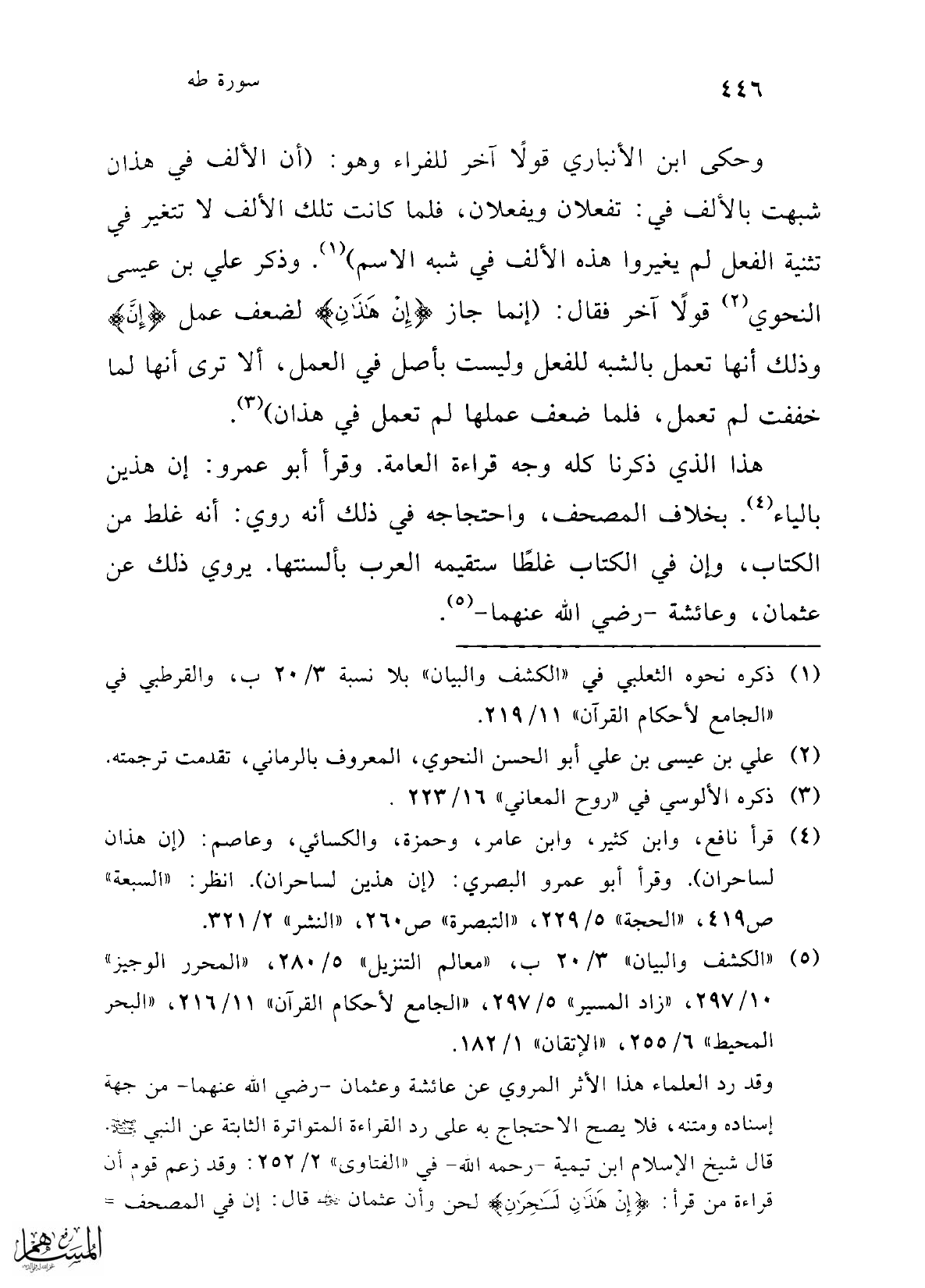 وقد رد العلماء هذا الأثر المروي عن عائشة وعثمان -رضي الله عنهما- من جهة إسناده ومتنه، فلا يصح الاحتجاج به على رد القراءة المتواترة الثابتة عن النبي -صلى الله عليه وسلم-. قال شيخ الإسلام ابن تيمية -رحمه الله- في "الفتاوى" 2/ 252: وقد زعم قوم أن قراءة من قرأ: {إِنْ هَذَانِ لَسَاحِرَانِ} لحن وأن عثمان -رضي الله عنه- قال: إن في المصحف =