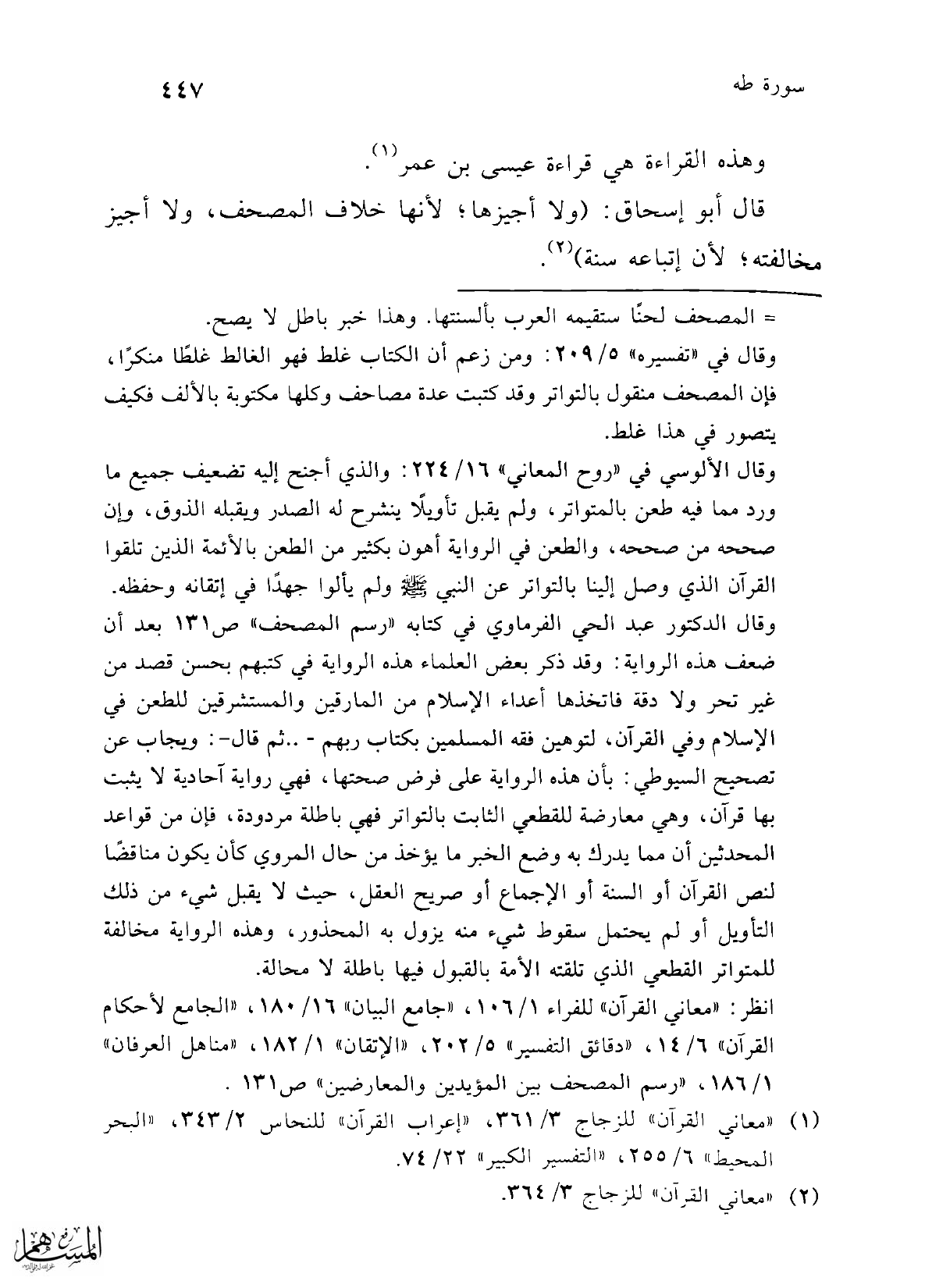 وقال الألوسي في "روح المعاني" 16/ 224: والذي أجنح إليه تضعيف جميع ما ورد مما فيه طعن بالمتواتر، ولم يقبل تأويلاً ينشرح له الصدر ويقبله الذوق، وإن صححه من صححه، والطعن في الرواية أهون بكثير من الطعن بالأئمة الذين تلقوا القرآن الذي وصل إلينا بالتواتر عن النبي -صلى الله عليه وسلم- ولم يألوا جهدًا في إتقانه وحفظه. وقال الدكتور عبد الحي الفرماوي في كتابه "رسم المصحف" ص 131 بعد أن ضعف هذه الرواية: وقد ذكر بعض العلماء هذه الرواية في كتبهم بحسن قصد من غير تحر ولا دقة فاتخذها أعداء الإسلام من المارقين والمستشرقين للطعن في الإسلام وفي القرآن، لتوهين فقه المسلمين بكتاب ربهم - .. ثم قال-: ويجاب عن تصحيح السيوطي: بأن هذه الرواية على فرض صحتها، فهي رواية آحادية لا يثبت بها قرآن، وهي معارضة للقطعي الثابت بالتواتر فهي باطلة مردودة، فإن من قواعد المحدثين أن مما يدرك به وضع الخبر ما يؤخذ من حال المروي كأن يكون مناقضًا لنص القرآن أو السنة أو الإجماع أو صريح العقل، حيث لا يقبل شيء من ذلك التأويل أو لم يحتمل سقوط شيء منه يزول به المحذور، وهذه الرواية مخالفة للمتواتر القطعي الذي تلقته الأمة بالقبول فيها باطلة لا محالة.