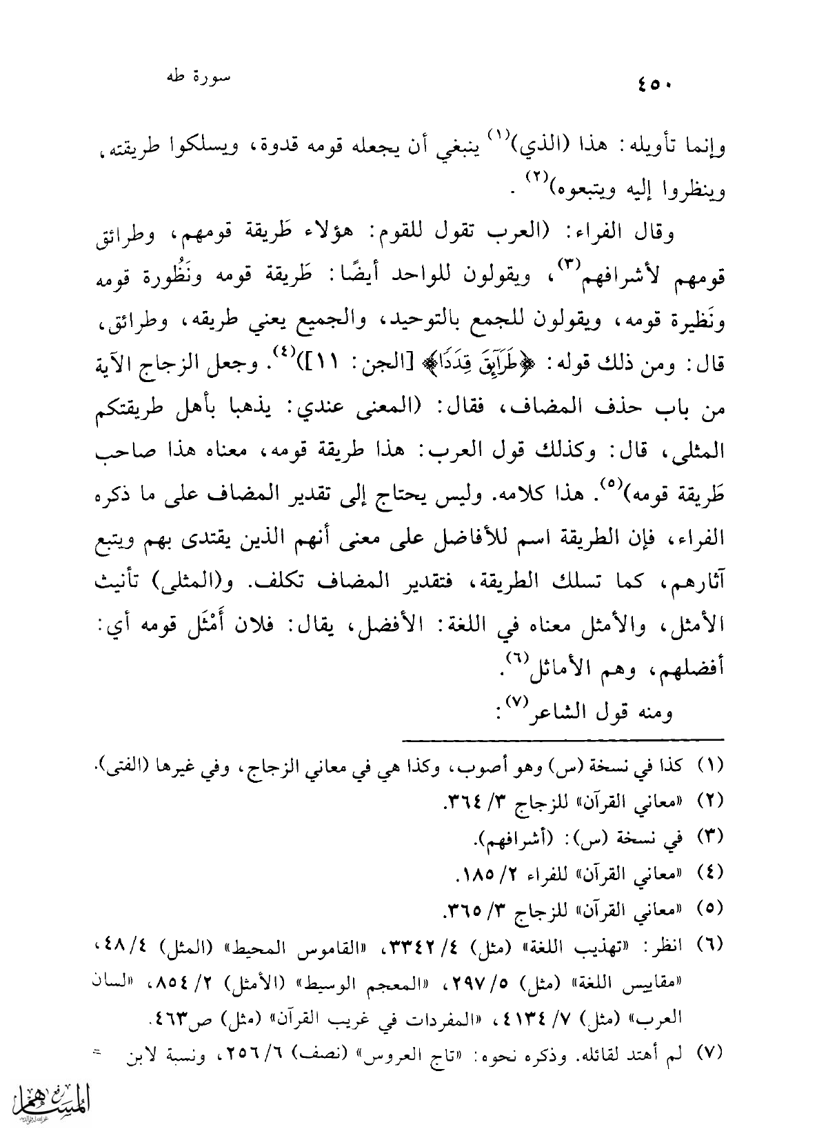 ونَظيرة قومه، ويقولون للجمع بالتوحيد، والجميع يعني طريقه، وطرائق، قال: ومن ذلك قوله: {طَرَائِقَ قِدَدًا} [الجن: 11]) (¬4). وجعل الزجاج الآية من باب حذف المضاف، فقال: (المعنى عندي: يذهبا بأهل طريقتكم المثلى، قال: وكذلك قول العرب: هذا طريقة قومه، معناه هذا صاحب طَريقة قومه) (¬5). هذا كلامه. وليس يحتاج إلى تقدير المضاف على ما ذكره الفراء، فإن الطريقة اسم للأفاضل على معنى أنهم الذين يقتدى بهم ويتبع آثارهم، كما تسلك الطريقة، فتقدير المضاف تكلف. و (المثلي) تأنيث الأمثل، والأمثل معناه في اللغة: الأفضل، يقال: فلان أَمْثَل قومه أي: أفضلهم، وهم الأماثل (¬6).