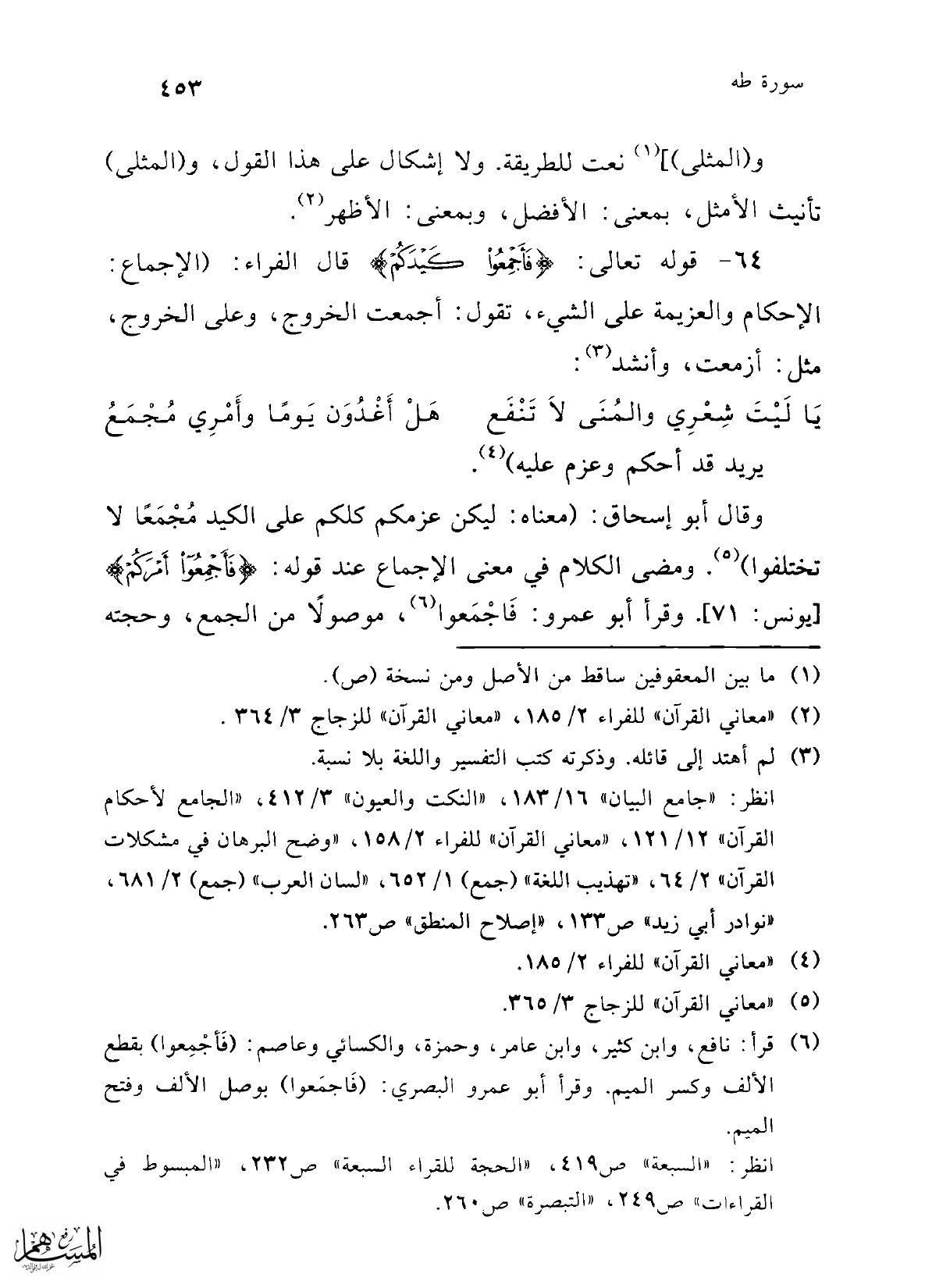 64 - قوله تعالى: {فَأَجْمِعُوا كَيْدَكُمْ} قال الفراء: (الإجماع: الأحكام والعزيمة على الشيء، تقول: أجمعت الخروج، وعلى الخروج، مثل: أزمعت، وأنشد (¬3):