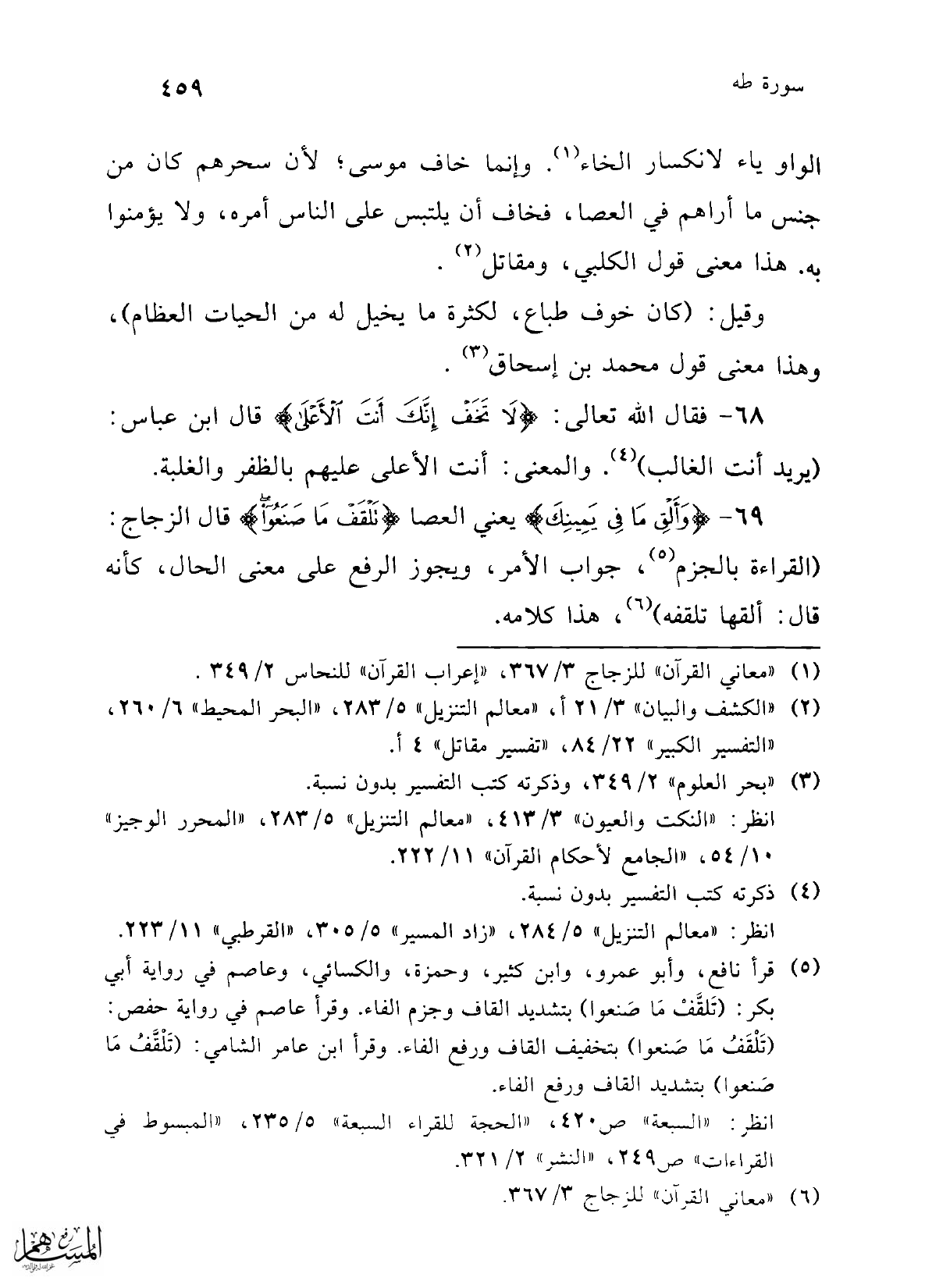 (¬5) قرأ نافع، وأبو عمرو، وابن كثير، وحمزة، والكسائي، وعاصم في رواية أبي بكر: (تَلقَّفْ مَا صَنعوا) بتشديد القاف وجزم الفاء. وقرأ عاصم في رواية حفص: (تَلْقَفُ مَا صَنعوا) بتخفيف القاف ورفع الفاء. وقرأ ابن عامر الشامي: (تَلْقَّفُ مَا صَنعوا) بتشديد القاف ورفع الفاء.