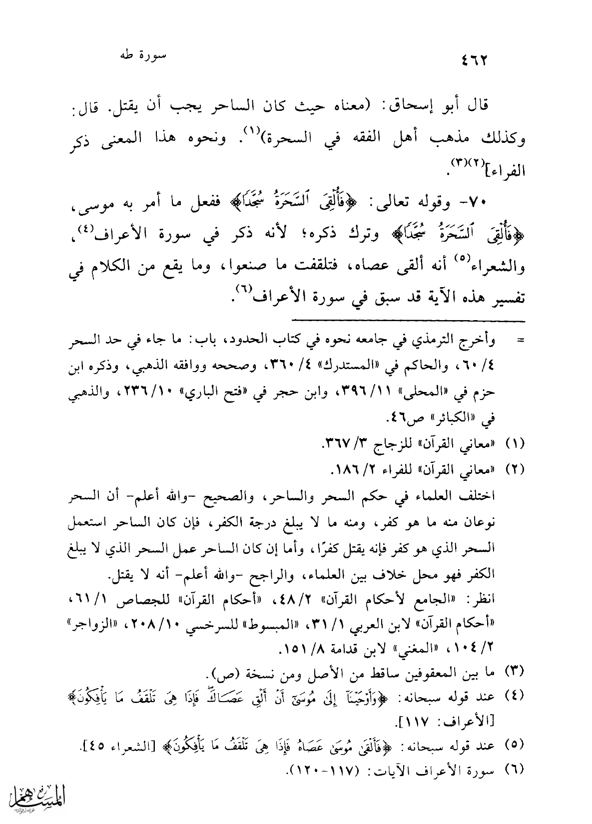 قال أبو إسحاق: (معناه حيث كان الساحر يجب أن يقتل. قال: وكذلك مذهب أهل الفقه في السحرة) (¬1). ونحوه هذا المعنى ذكر الفراء] (¬2) (¬3).