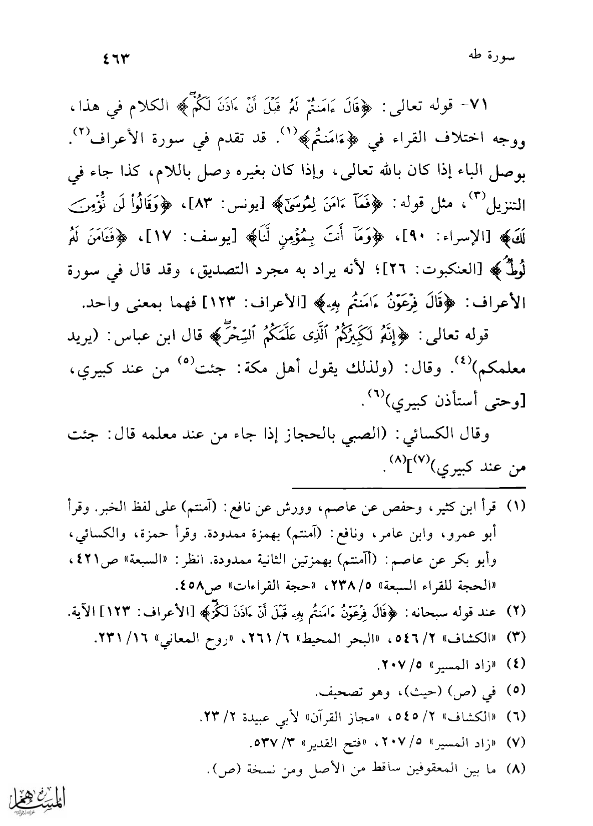 71 - قوله تعالى: {قَالَ آمَنْتُمْ لَهُ قَبْلَ أَنْ آذَنَ لَكُمْ} الكلام في هذا، ووجه اختلاف القراء في {آمَنْتُمْ} (¬1). قد تقدم في سورة الأعراف (¬2). بوصل الباء إذا كان باللهِ تعالى، وإذا كان بغيره وصل باللام، كذا جاء في التنزيل (¬3)، مثل قوله: {فَمَا آمَنَ لِمُوسَى} [يونس: 83]، {وَقَالُوا لَنْ نُؤْمِنَ لَكَ} [الإسراء: 90]، {وَمَا أَنْتَ بِمُؤْمِنٍ لَنَا} [يوسف: 17]، {فَآمَنَ لَهُ لُوطٌ} [العنكبوت: 26]؛ لأنه يراد به مجرد التصديق، وقد قال في سورة الأعراف: {قَالَ فِرْعَوْنُ آمَنْتُمْ بِهِ} [الأعراف: 123]، فهما بمعنى واحد.