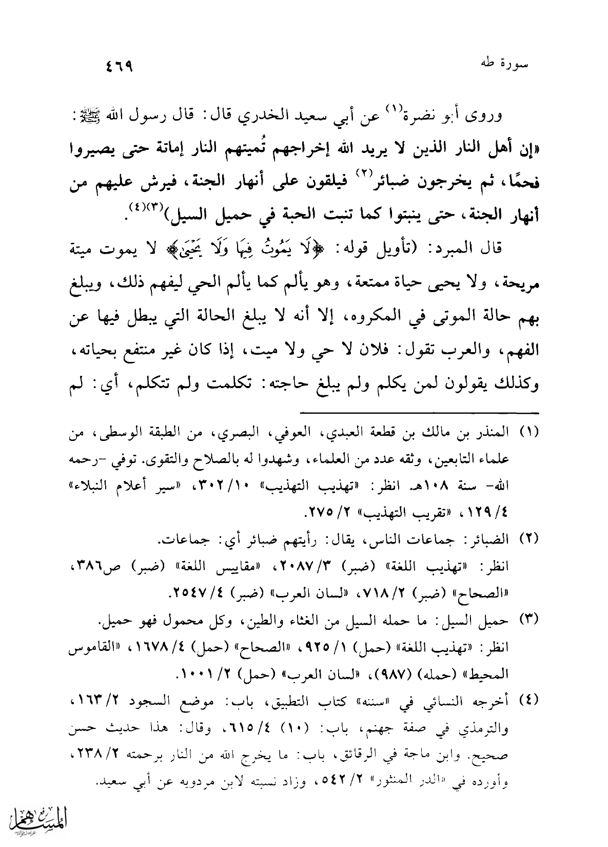 وروى أبو نضرة (¬1) عن أبي سعيد الخدري قال: قال رسول الله -صلى الله عليه وسلم-: "إن أهل النار الذين لا يريد الله إخراجهم تُميتهم النار إماتة حتى يصيروا فحمًا، ثم يخرجون ضبائر (¬2) فيلقون على أنهار الجنة، فيرش عليهم من أنهار الجنة، حتى ينبتوا كما تنبت الحبة في حميل السيل) (¬3) (¬4).