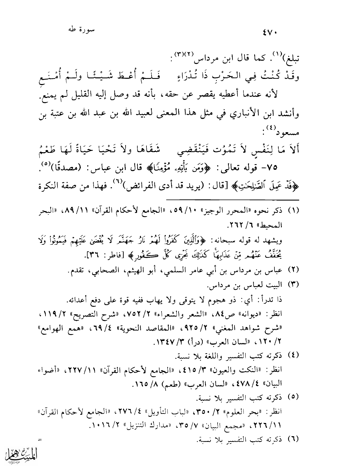 75 - قوله تعالى: {وَمَنْ يَأْتِهِ مُؤْمِنًا} قال ابن عباس: (مصدقًا) (¬5). {قَدْ عَمِلَ الصَّالِحَاتِ} [قال: (يريد قد أدى الفرائض) (¬6). فهذا من صفة النكرة