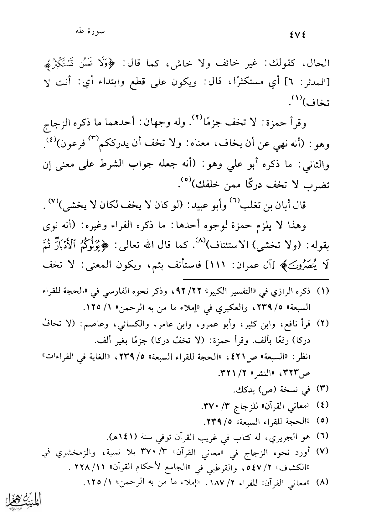 وهذا لا يلزم حمزة لوجوه أحدها: ما ذكره الفراء وغيره: (أنه نوى بقوله: (ولا تخشى) الاستئناف) (¬8). كما قال الله تعالى: {يُوَلُّوكُمُ الْأَدْبَارَ ثُمَّ لَا يُنْصَرُونَ} [آل عمران: 111]، فاستأنف بثم، ويكون المعنى: لا تخف
