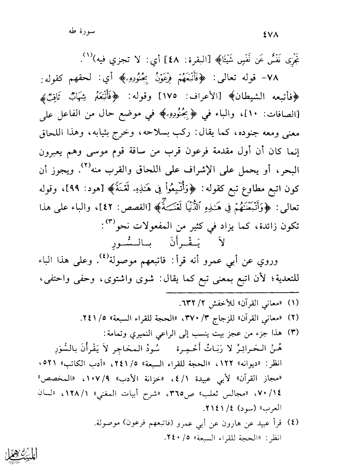 78 - قوله تعالى: {فَأَتْبَعَهُمْ فِرْعَوْنُ بِجُنُودِهِ} أي: لحقهم كقوله. {فَأَتْبَعَهُ الشَّيْطَانُ} [الأعراف: 175] وقوله: {فَأَتْبَعَهُ شِهَابٌ ثَاقِبٌ} [الصافات: 10]، والباء في {بِجُنُودِهِ} في موضع حال من الفاعل على معنى ومعه جنوده، كما يقال: ركب بسلاحه، وخرج بثيابه، وهذا اللحاق إنما كان أن أول مقدمة فرعون قرب من ساقة قوم موسى وهم يعبرون البحر، أو يحمل على الإشراف على اللحاق والقرب منه (¬2). ويجوز أن كون اتبع مطاوع تبع كقوله: {وَأُتْبِعُوا فِي هَذِهِ لَعْنَةً} [هود: 99]، وقوله تعالى: {وَأَتْبَعْنَاهُمْ فِي هَذِهِ الدُّنْيَا لَعْنَةً} [القصص: 42]، والباء على هذا تكون زائدة، كما يزاد في كثير من المفعولات نحو (¬3):
