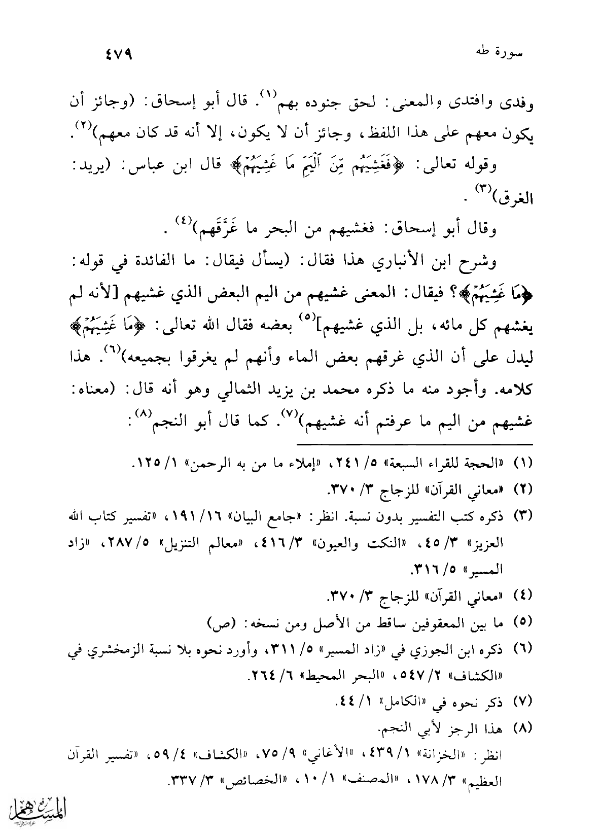 وشرح ابن الأنباري هذا فقال: (يسأل فيقال: ما الفائدة في قوله: {مَا غَشِيَهُمْ}؟ فيقال: المعنى غشيهم من اليم البعض الذي غشيهم [لأنه لم يغشهم كل مائه، بل الذي غشيهم] (¬5) بعضه فقال الله تعالى: {مَا غَشِيَهُمْ} ليدل على أن الذي غرقهم بعض الماء وأنهم لم يغرقوا بجميعه) (¬6). هذا كلامه. وأجود منه ما ذكره محمد بن يزيد الثمالي وهو أنه قال: (معناه: غشيهم من اليم ما عرفتم أنه غشيهم) (¬7). كما قال أبو النجم (¬8):