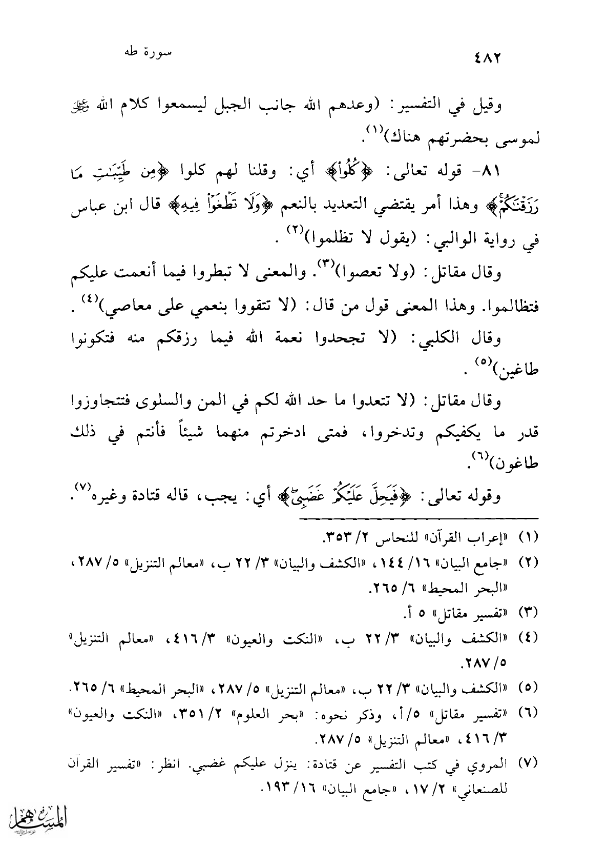 وقال مقاتل: (لا تتعدوا ما حد الله لكم في المن والسلوى فتتجاوزوا قدر ما يكفيكم وتدخروا، فمتى ادخرتم منهما شيئًا فأنتم في ذلك طاغون) (¬6).