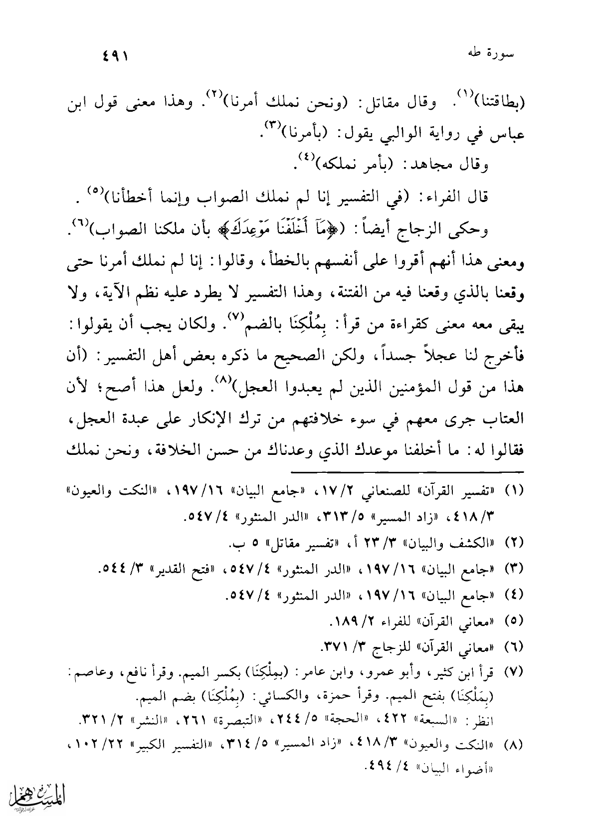 وحكى الزجاج أيضًا: ({مَا أَخْلَفْنَا مَوْعِدَكَ} بأن ملكنا الصواب) (¬6). ومعنى هذا أنهم أقروا على أنفسهم بالخطأ، وقالوا: إنا لم نملك أمرنا حتى وقعنا بالذي وقعنا فيه من الفتنة، وهذا التفسير لا يطرد عليه نظم الآية، ولا يبقى معه معنى كقراءة من قرأ: بِمُلْكِنَا بالضم (¬7). ولكان يجب أن يقولوا: فأخرج لنا عجلًا جسدًا، ولكن الصحيح ما ذكره بعض أهل التفسير: (أن هذا من قول المؤمنين الذين لم يعبدوا العجل) (¬8). ولعل هذا أصح؛ لأن العتاب جرى معهم في سوء خلافتهم من ترك الإنكار على عبدة العجل، فقالوا له: ما أخلفنا موعدك الذي وعدناك من حسن الخلافة، ونحن نملك