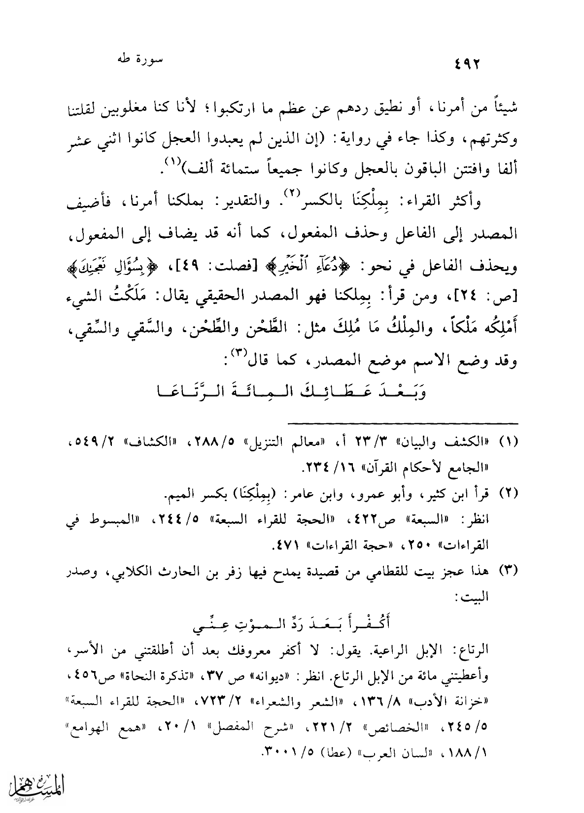 وأكثر القراء: بِمِلْكِنَا بالكسر (¬2). والتقدير: بملكنا أمرنا، فأضيف المصدر إلى الفاعل وحذف المفعول، كما أنه قد يضاف إلى المفعول، ويحذف الفاعل في نحو: {دُعَاءِ الْخَيْرِ} [فصلت: 49]، {بِسُؤَالِ نَعْجَتِكَ} [ص: 24]، ومن قرأ: بِمِلكنا فهو المصدر الحقيقي يقال: مَلَكْتُ الشيء أَمْلِكُه مَلْكًا، والمِلْكُ ما مُلِكَ مثل: الطَّحْن والطِّحْن، والسَّقي والسِّقي، وقد وضع الاسم موضع المصدر، كما قال (¬3):