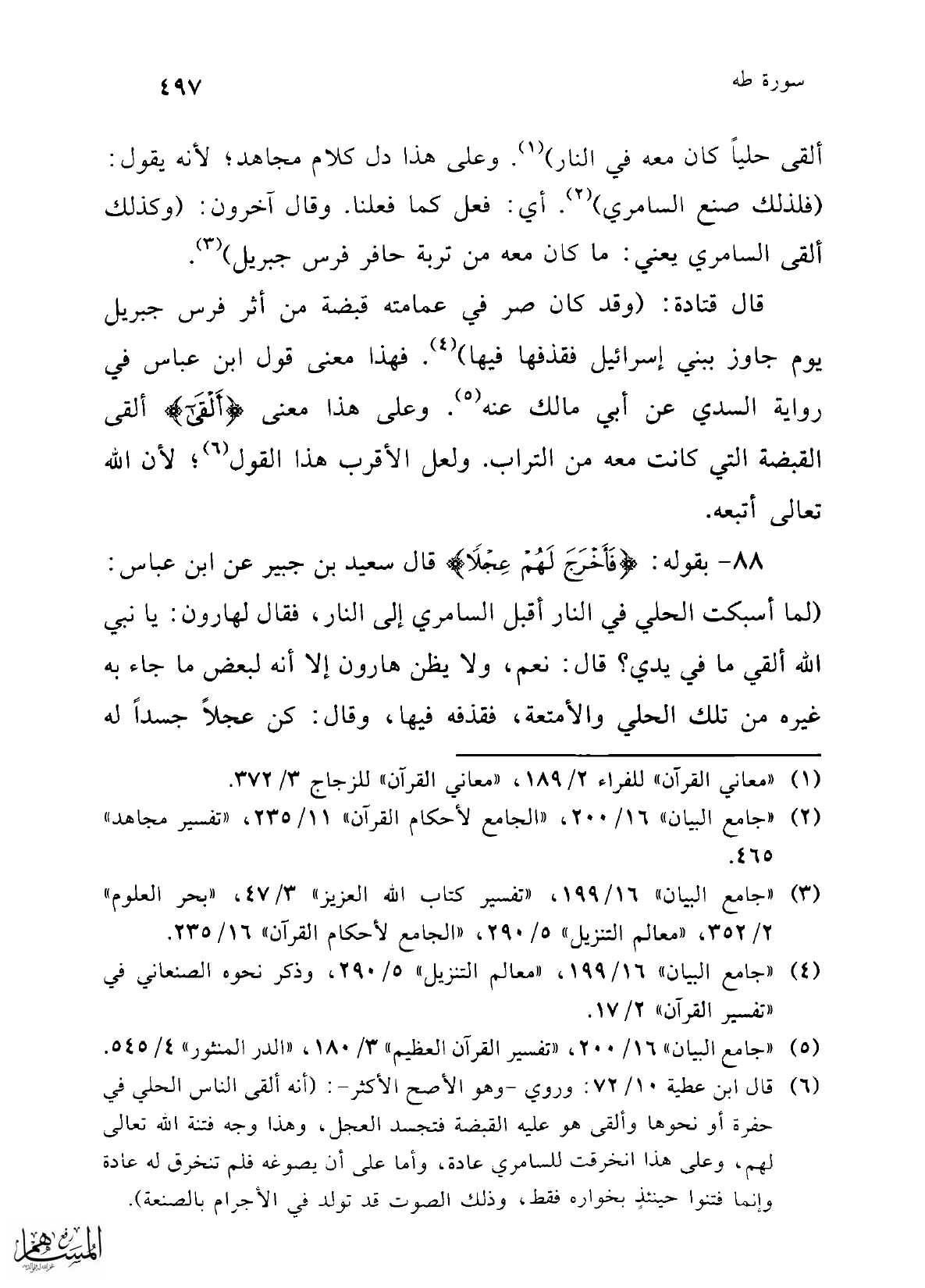 88 - بقوله: {فَأَخْرَجَ لَهُمْ عِجْلًا} قال سعيد بن جبير عن ابن عباس: (لما أسبكت الحلي في النار أقبل السامري إلى النار، فقال لهارون: يا نبي الله ألقي ما في يدي؟ قال: نعم، ولا يظن هارون إلا أنه لبعض ما جاء به غيره من تلك الحلي والأمتعة، فقذفه فيها، وقال: كن عجلًا جسدًا له