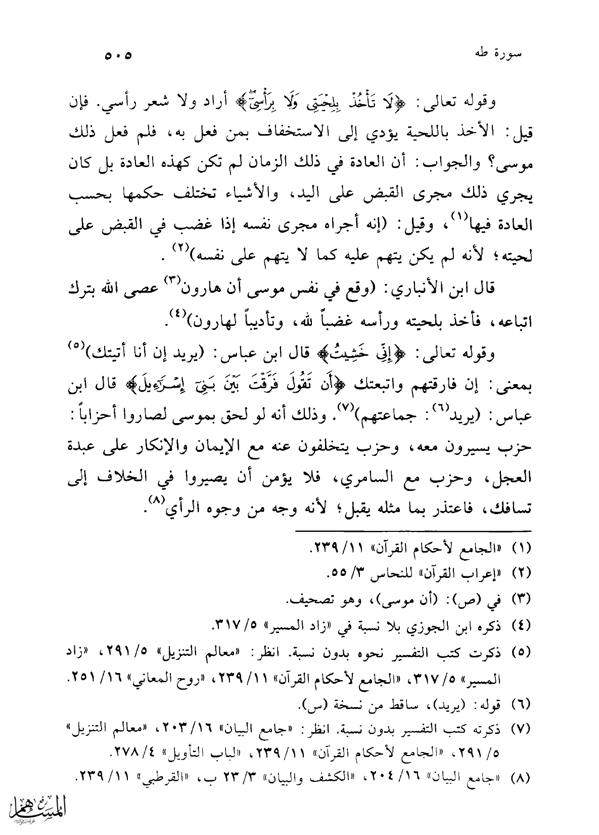 وقوله تعالى: {لَا تَأْخُذْ بِلِحْيَتِي وَلَا بِرَأْسِي} أراد ولا شعر رأسي. فإن قيل: الأخذ باللحية يؤدي إلى الاستخفاف بمن فعل به، فلم فعل ذلك موسى؟ والجواب: أن العادة في ذلك الزمان لم تكن كهذه العادة بل كان يجري ذلك مجرى القبض على اليد، والأشياء تختلف حكمها بحسب العادة فيها (¬1)، وقيل: (إنه أجراه مجرى نفسه إذا غضب في القبض على لحيته؛ لأنه لم يكن يتهم عليه كما لا يتهم على نفسه) (¬2).