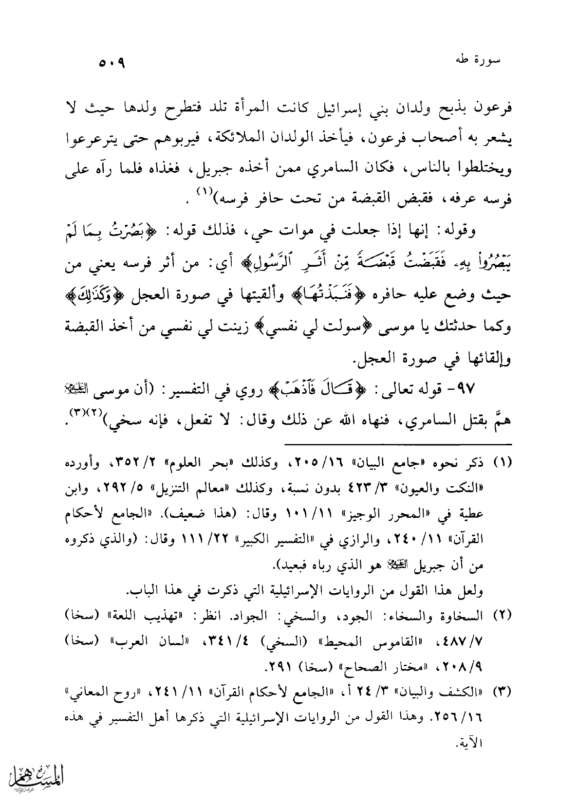 97 - قوله تعالى: {قَالَ فَاذْهَبْ} روي في التفسير: (أن موسى -عليه السلام- همَّ بقتل السامري، فنهاه الله عن ذلك وقال: لا تفعل، فإنه سخي) (¬2) (¬3).