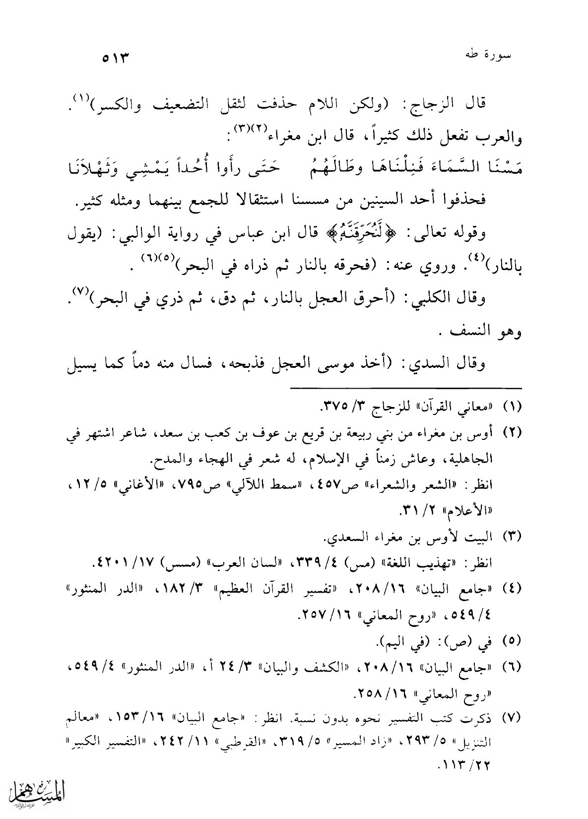 وقوله تعالى: {لَنُحَرِّقَنَّهُ} قال ابن عباس في رواية الوالبي: (يقول بالنار) (¬4). وروي عنه: (فحرقه بالنار ثم ذراه في البحر) (¬5) (¬6).