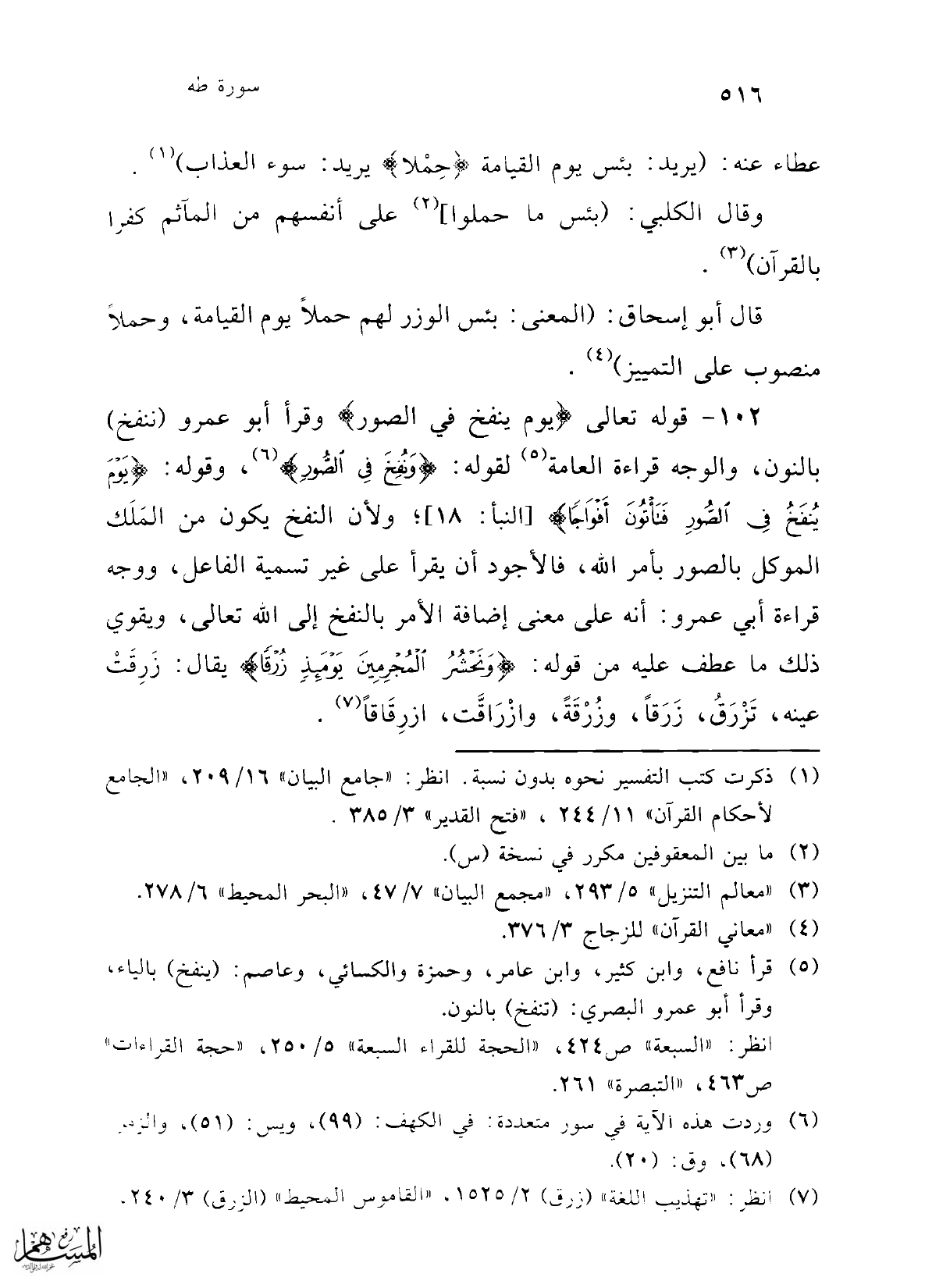 102 - قوله تعالى {يَوْمَ يُنْفَخُ فِي الصُّورِ} وقرأ أبو عمرو (ننفخ) بالنون، والوجه قراءة العامة (¬5) لقوله: {وَنُفِخَ فِي الصُّورِ} (¬6)، وقوله: {يَوْمَ يُنْفَخُ فِي الصُّورِ فَتَأْتُونَ أَفْوَاجًا} [النبأ: 18]، ولأن النفخ يكون من المَلَك الموكل بالصور بأمر الله، فالأجود أن يقرأ على غير تسمية الفاعل، ووجه قراءة أبي عمرو: أنه على معنى إضافة الأمر بالنفخ إلى الله تعالى، ويقوي ذلك ما عطف عليه من قوله: {وَنَحْشُرُ الْمُجْرِمِينَ يَوْمَئِذٍ زُرْقًا} يقال: زَرِقَت عينه، تَزْرَقُ، زَرَقًا، وزُرْقَةً، وازْرَاقَّت، ازرِقَاقًا (¬7).