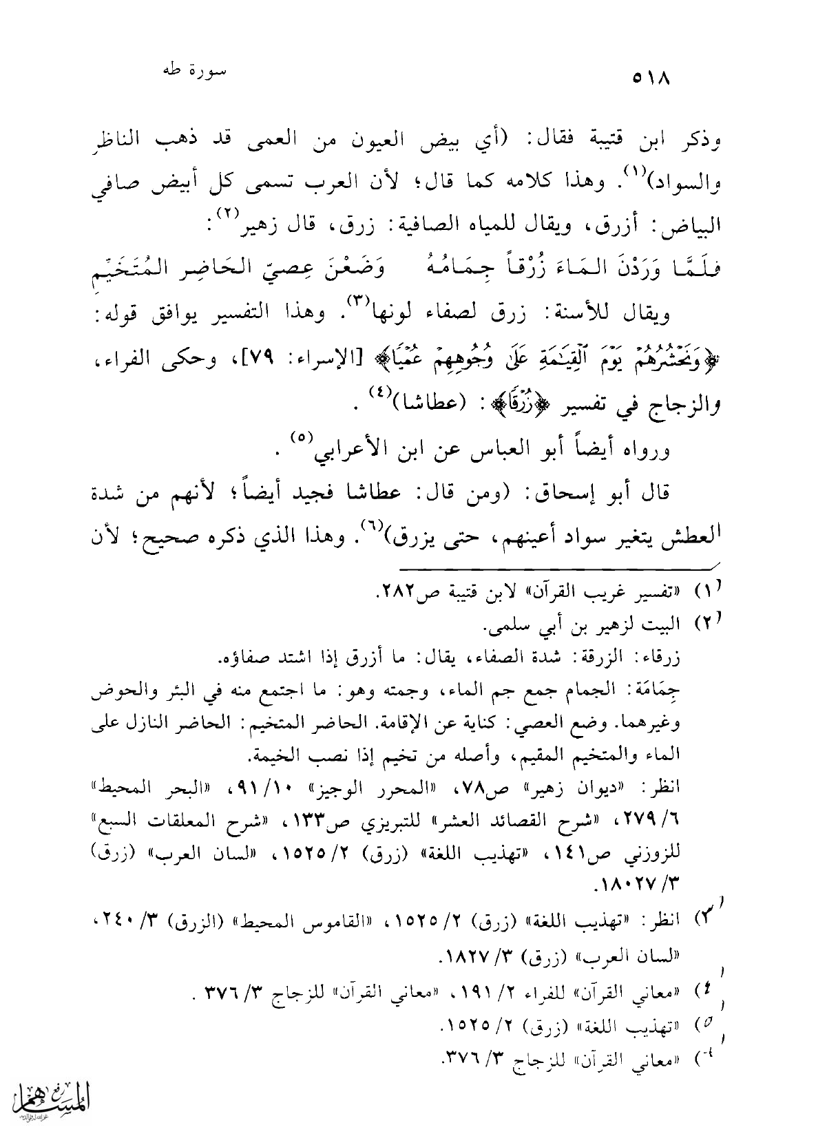 انظر: "ديوان زهير" ص 78، "المحرر الوجيز" 10/ 91، "البحر المحيط" 6/ 279، "شرح القصائد العشر" للتبريزي ص 133، "شرح المعلقات السبع" للزوزني ص 141، "تهذيب اللغة" (زرق) 2/ 1525، "لسان العرب" (زرق) 3/ 18027.
