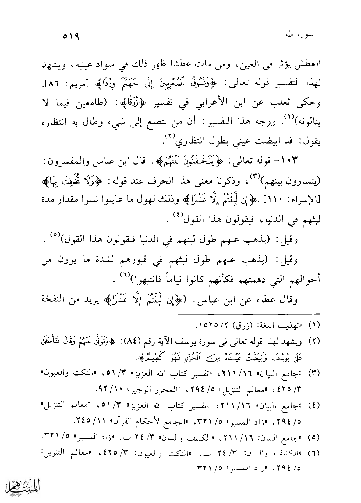 العطش يؤثر في العين، ومن مات عطشا ظهر ذلك في سواد عينيه، ويشهد لهذا التفسير قوله تعالى: {وَنَسُوقُ الْمُجْرِمِينَ إِلَى جَهَنَّمَ وِرْدًا} [مريم: 86]. وحكى ثعلب عن ابن الأعرابي في تفسير {زُرْقًا}: (طامعين فيما لا ينالونه) (¬1). ووجه هذا التفسير: أن من يتطلع إلى شيء وطال به انتظاره يقول: قد ابيضت عيني بطول انتظاري (¬2).