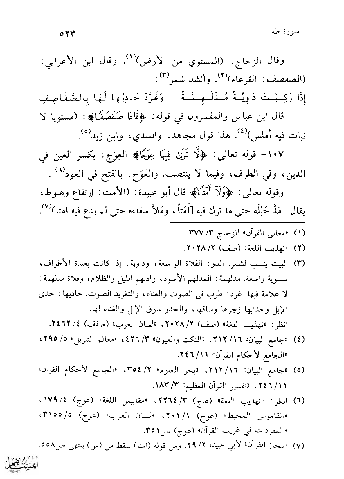 قال ابن عباس والمفسرون في قوله: {قَاعًا صَفْصَفًا}: (مستويا لا نبات فيه أملس) (¬4). هذا قول مجاهد، والسدي، وابن زيد (¬5).