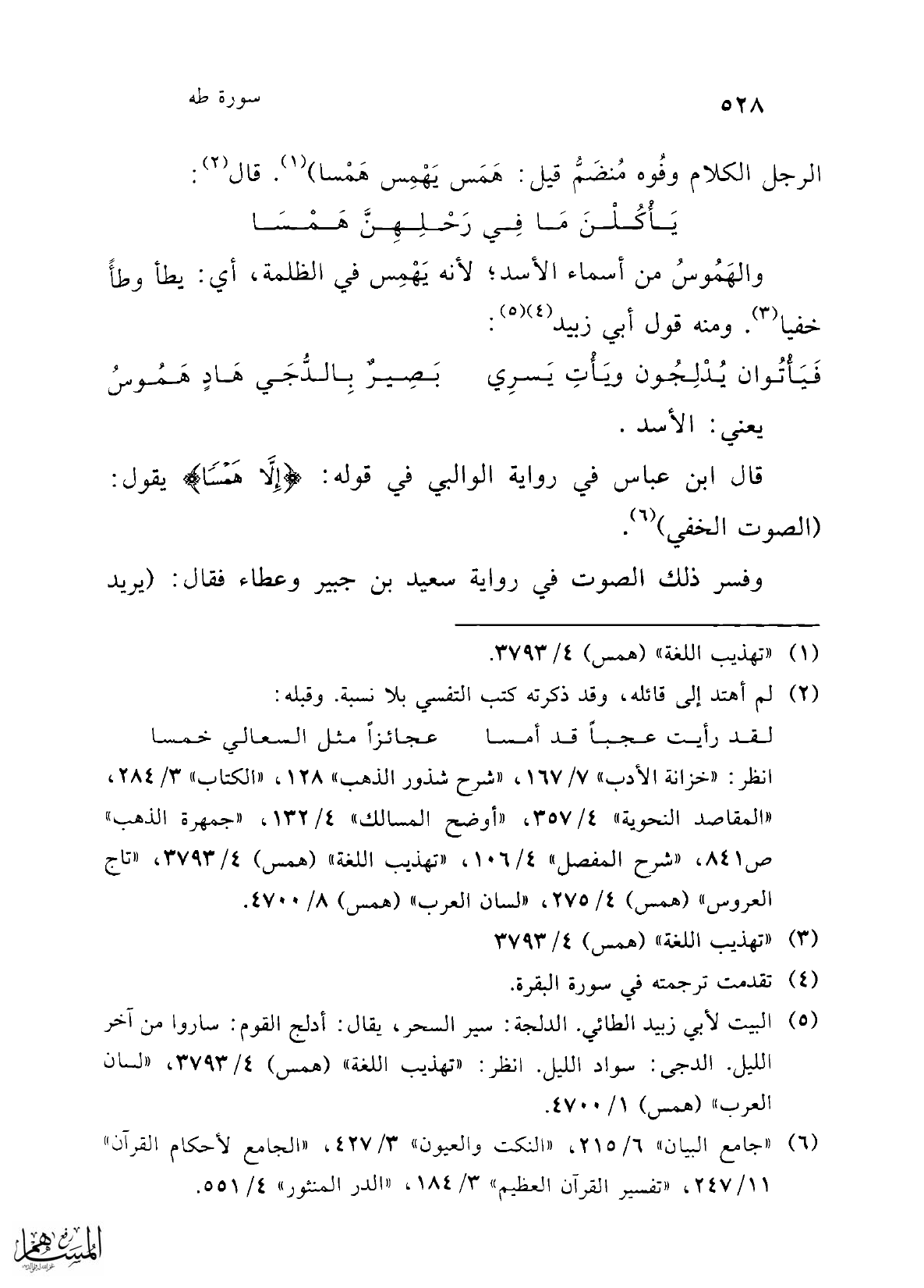 (¬5) البيت لأبي زبيد الطائي. الدلجة: سير السحر، يقال: أدلج القوم: ساروا من آخر الليل. الدجى: سواد الليل. انظر: "تهذيب اللغة" (همس) 4/ 3793، "لسان العرب" (همس) 1/ 4700.