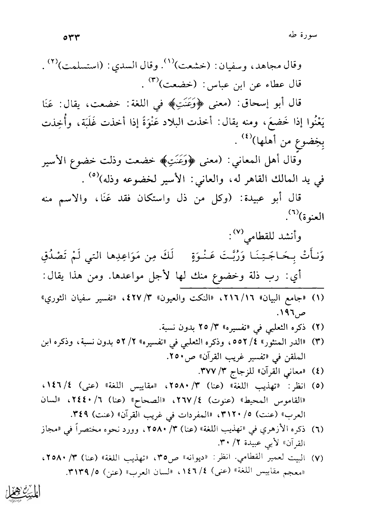 وقال أهل المعاني: (معنى {وَعَنَتِ} خضعت وذلت خضوع الأسير في يد المالك القاهر له، والعاني: الأسير لخضوعه وذله) (¬5).