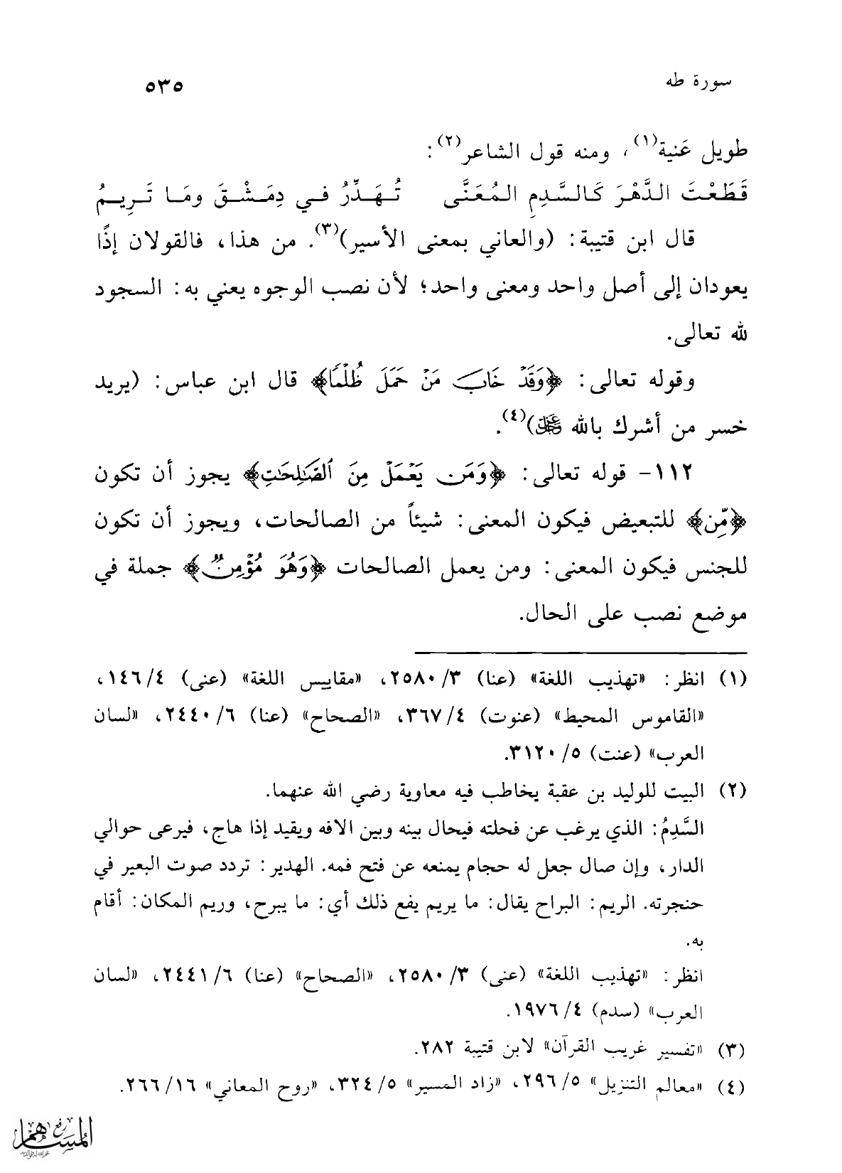 قال ابن قتيبة: (والعاني بمعنى الأسير) (¬3). من هذا، فالقولان إذًا يعودان إلى أصل واحد ومعنى واحد؛ لأن نصب الوجوه يعني به: السجود لله تعالى.