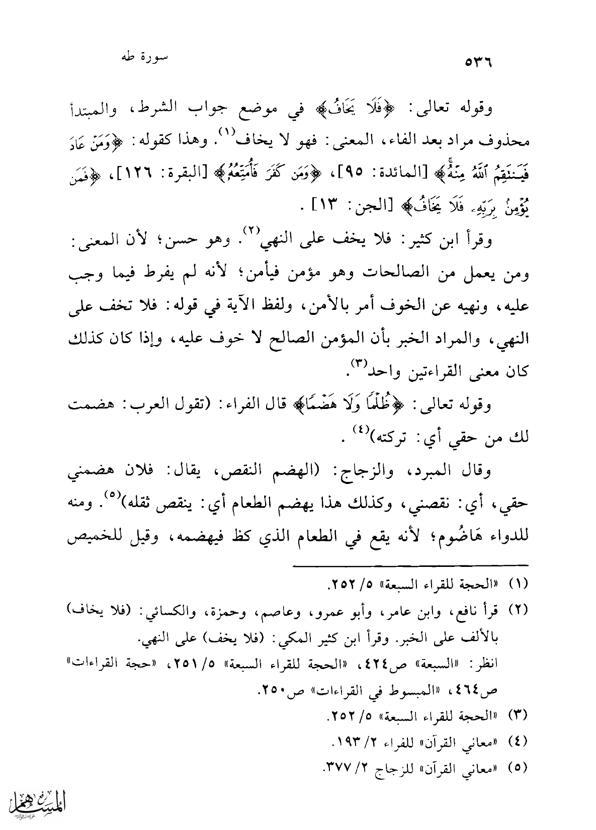 وقرأ ابن كثير: فلا يخف على النهي (¬2). وهو حسن؛ لأن المعنى: ومن يعمل من الصالحات وهو مؤمن فيأمن؛ لأنه لم يفرط فيما وجب عليه، ونهيه عن الخوف أمر بالأمن، ولفظ الآية في قوله: فلا تخف على النهي، والمراد الخبر بأن المؤمن الصالح لا خوف عليه، وإذا كان كذلك كان معنى القراءتين واحد (¬3).