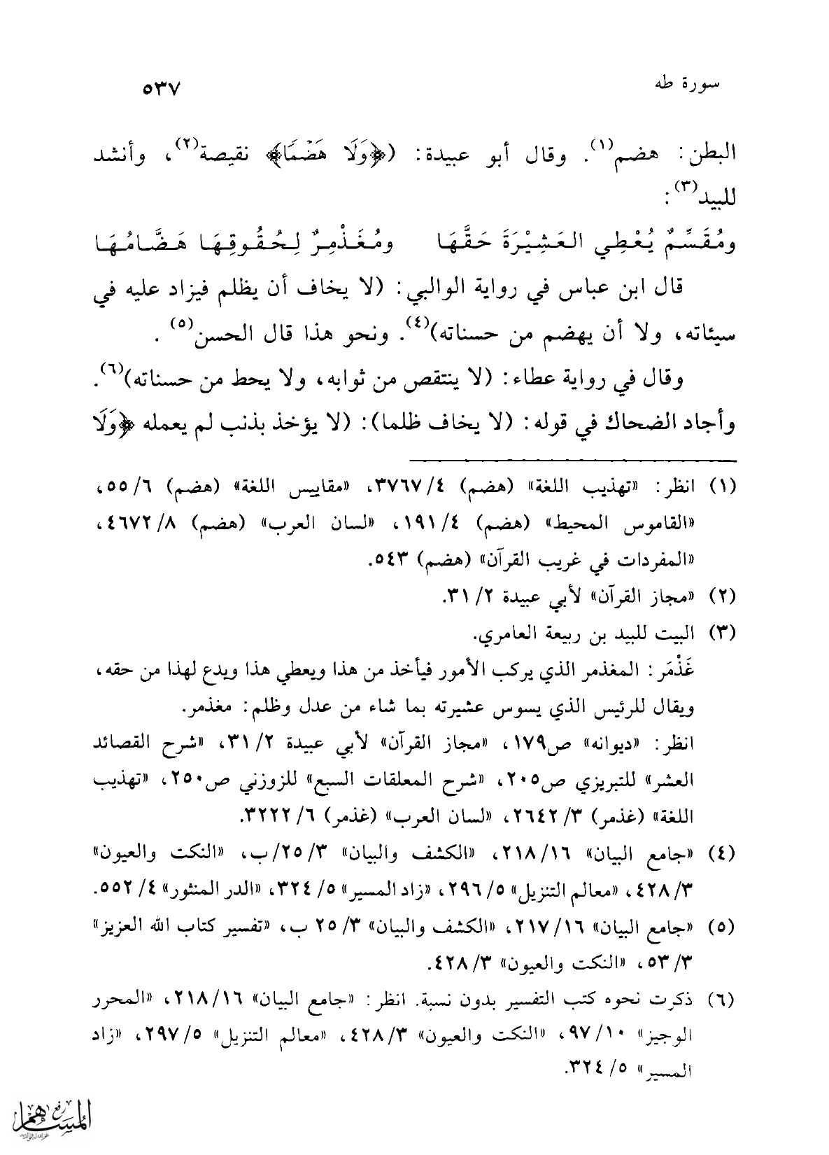 البطن: هضم (¬1). وقال أبو عبيدة: ({وَلَا هَضْمًا} نقيصة (¬2)، وأنشد للبيد (¬3):