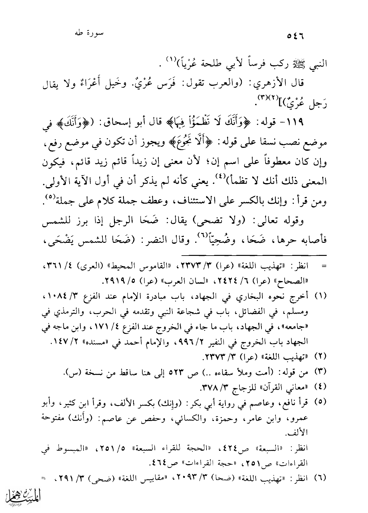 119 - قوله: {وَأَنَّكَ لَا تَظْمَأُ فِيهَا} قال أبو إسحاق: {وَأَنَّكَ} في موضع نصب نسقا على قوله: {أَلَّا تَجُوعَ} ويجوز أن تكون في موضع رفع، وإن كان معطوفًا على اسم إن؛ لأن معنى إن زيدًا قائم زيد قائم، فيكون المعنى ذلك أنك لا تظمأ) (¬4). يعني كأنه لم يذكر أن في أول الآية الأولى. ومن قرأ: وإنك بالكسر على الاستئناف، وعطف جملة كلام على جملة (¬5).