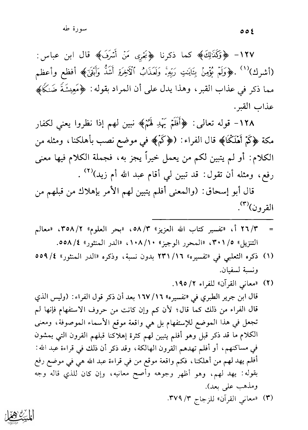 128 - قوله تعالى: {أَفَلَمْ يَهْدِ لَهُمْ} نبين لهم إذا نظروا يعني لكفار مكة {كَمْ أَهْلَكْنَا} قال الفراء: ({كَمْ} في موضع نصب بأهلكنا، ومثله من الكلام: أو لم يتبين لكم من يعمل خيرًا يجز به، فجملة الكلام فيها معنى رفع، ومثله أن تقول: قد تبين لي أقام عبد الله أم زيد) (¬2).