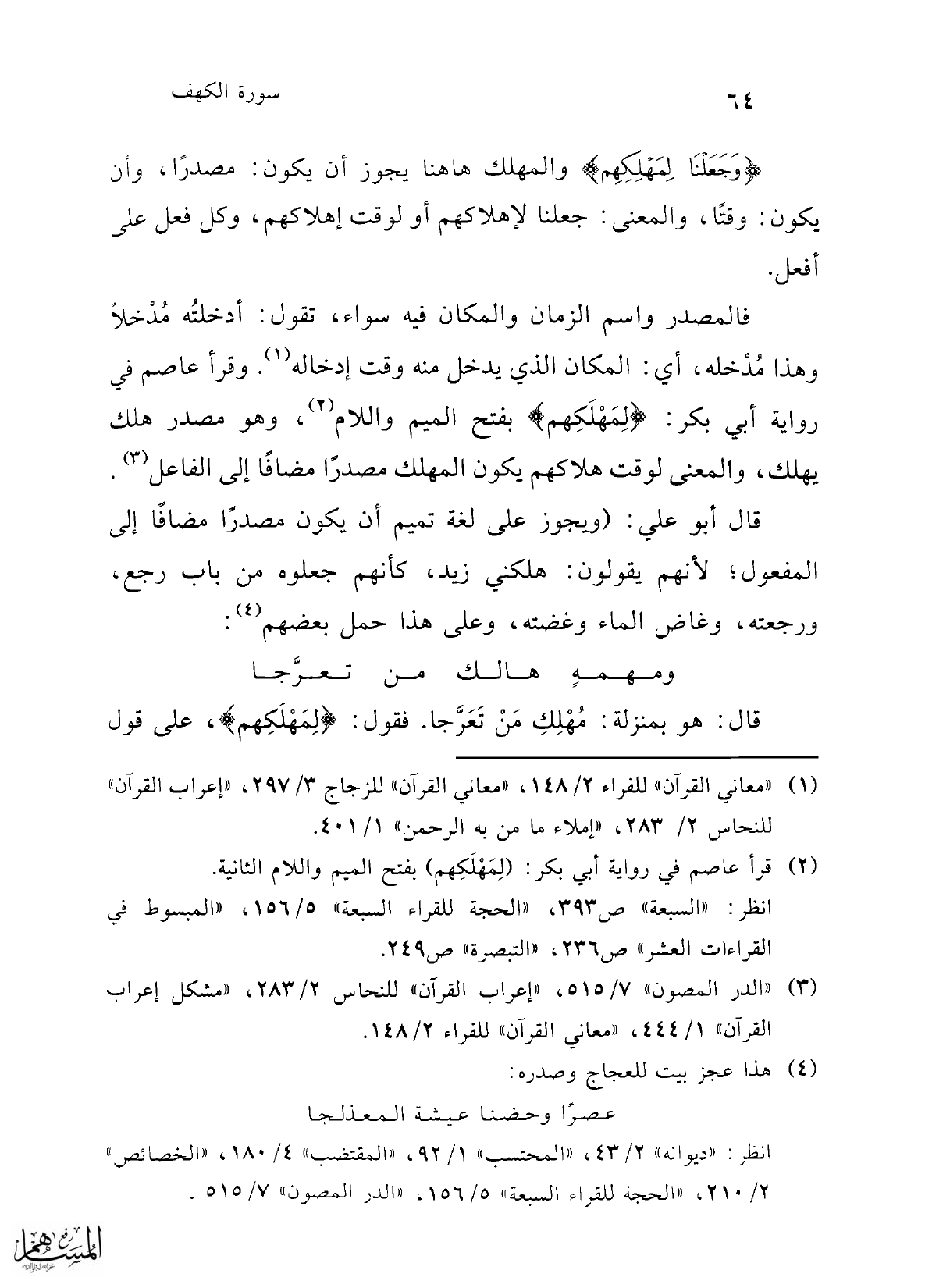 فالمصدر واسم الزمان والمكان فيه سواء، تقول: أدخلتُه مُدْخلاً وهذا مُدْخله، أي: المكان الذي يدخل منه وقت إدخاله (¬1). وقرأ عاصم في رواية أبي بكر: {لِمَهْلَكِهم} بفتح الميم واللام (¬2)، وهو مصدر هلك يهلك، والمعنى لوقت هلاكهم يكون المهلك مصدرًا مضافًا إلى الفاعل (¬3).