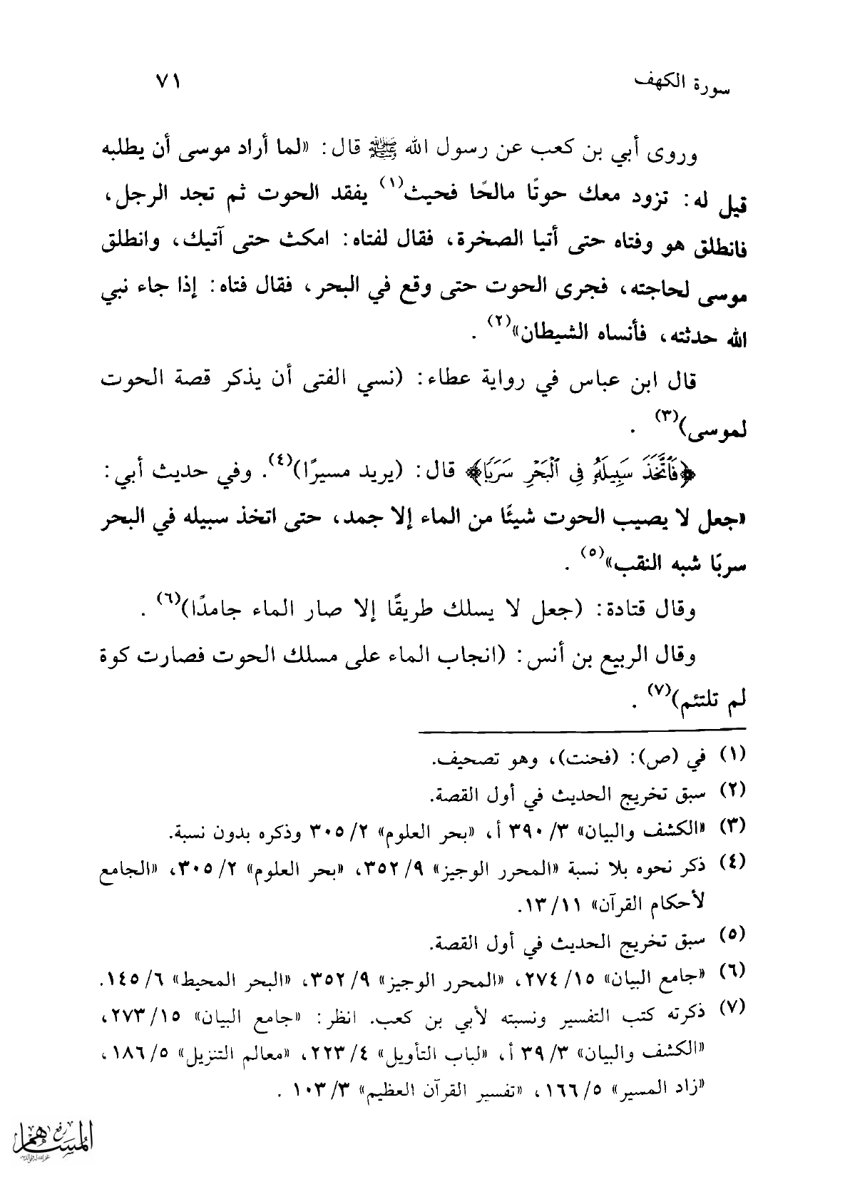 وقال الربيع بن أنس: (انجاب الماء على مسلك الحوت فصارت كوة لم تلتئم) (¬7).
