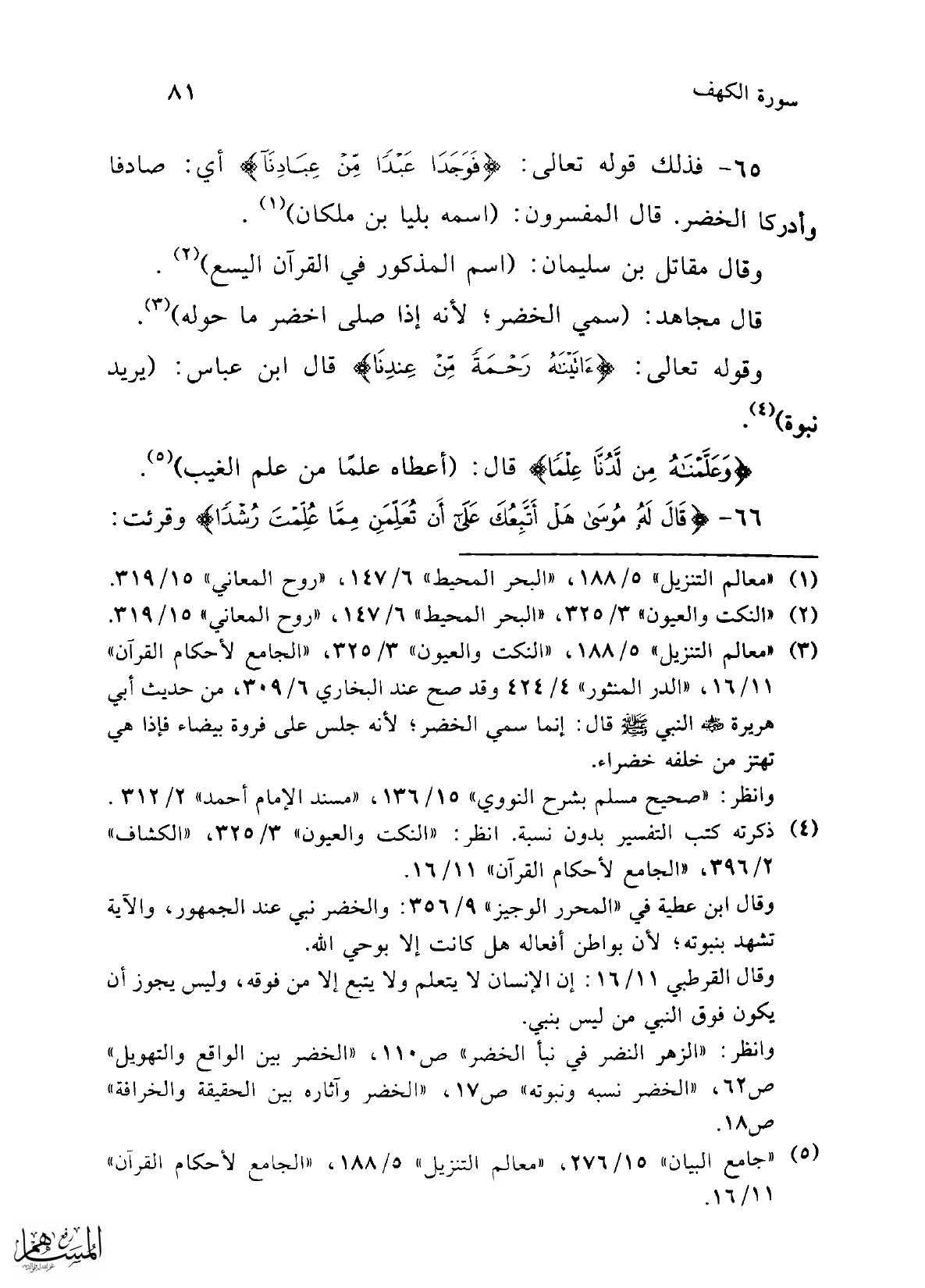 (¬3) "معالم التنزيل" 5/ 188، "النكت والعيون" 3/ 325، "الجامع لأحكام القرآن" 11/ 16، "الدر المنثور" 4/ 424 وقد صح عند البخاري 6/ 309، من حديث أبي هريرة -رضي الله عنه- النبي -صلى الله عليه وسلم- قال: إنما سمي الخضر؛ لأنه جلس على فروة بيضاء فإذا هي تهتز من خلفه خضراء.