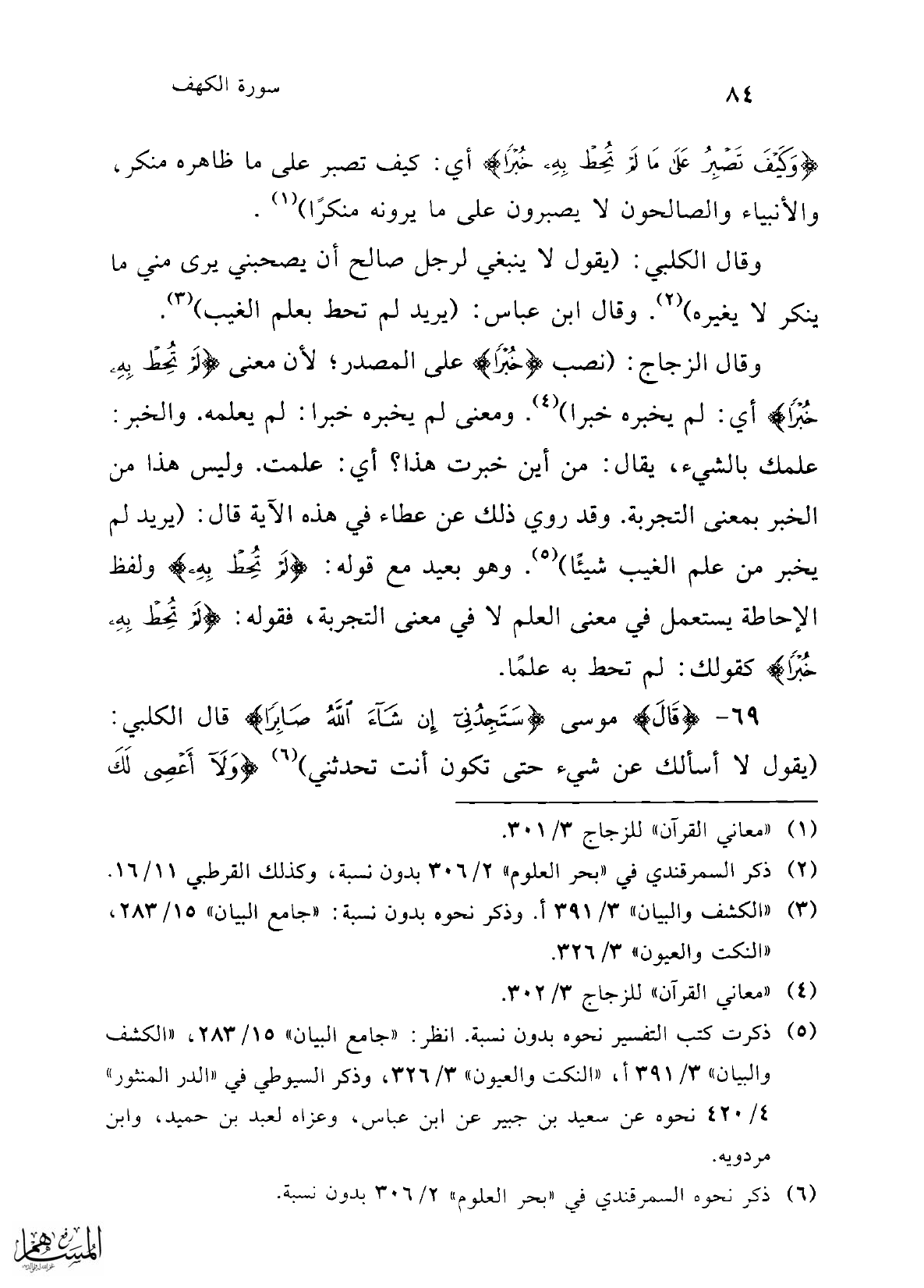 {وَكَيْفَ تَصْبِرُ عَلَى مَا لَمْ تُحِطْ بِهِ خُبْرًا} أي: كيف تصبر على ما ظاهره منكر، والأنبياء والصالحون لا يصبرون على ما يرونه منكرًا) (¬1).