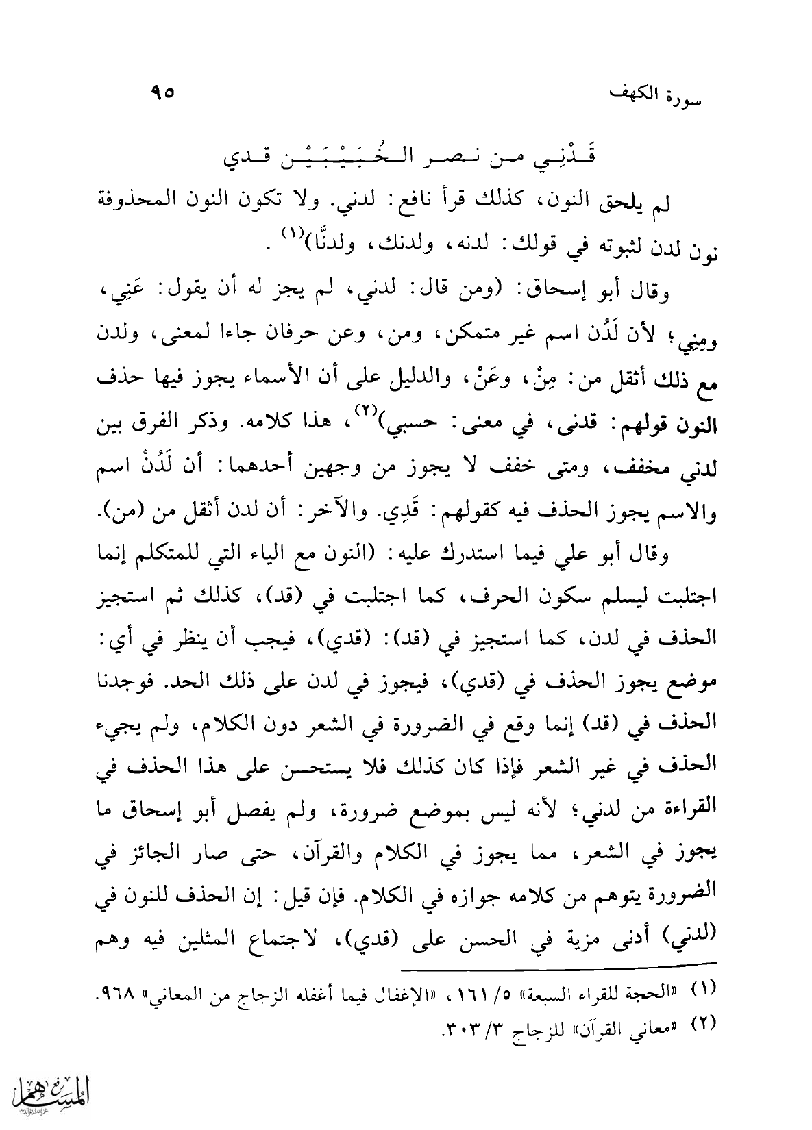وقال أبو علي فيما استدرك عليه: (النون مع الياء التي للمتكلم إنما اجتلبت ليسلم سكون الحرف، كما اجتلبت في (قد)، كذلك ثم استجيز الحذف في لدن، كما استجيز في (قد): (قدي)، فيجب أن ينظر في أي: موضع يجوز الحذف في (قدي)، فيجوز في لدن على ذلك الحد. فوجدنا الحذف في (قد) إنما وقع في الضرورة في الشعر دون الكلام، ولم يجيء الحذف في غير الشعر فإذا كان كذلك فلا يستحسن على هذا الحذف في القراءة من لدني؛ لأنه ليس بموضع ضرورة، ولم يفصل أبو إسحاق ما يجوز في الشعر، مما يجوز في الكلام والقرآن، حتى صار الجائز في الضرورة يتوهم من كلامه جوازه في الكلام. فإن قيل: إن الحذف للنون في (لدني) أدنى مزية في الحسن على (قدي)، لاجتماع المثلين فيه وهم
