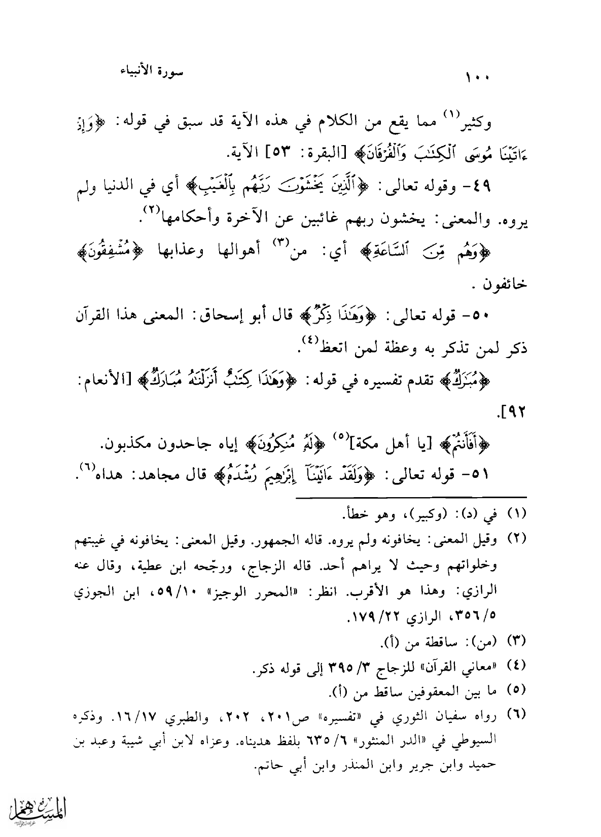 50 - قوله تعالى: {وَهَذَا ذِكْرٌ} قال أبو إسحاق: المعنى هذا القرآن ذكر لمن تذكر به وعظة لمن اتعظ (¬4).