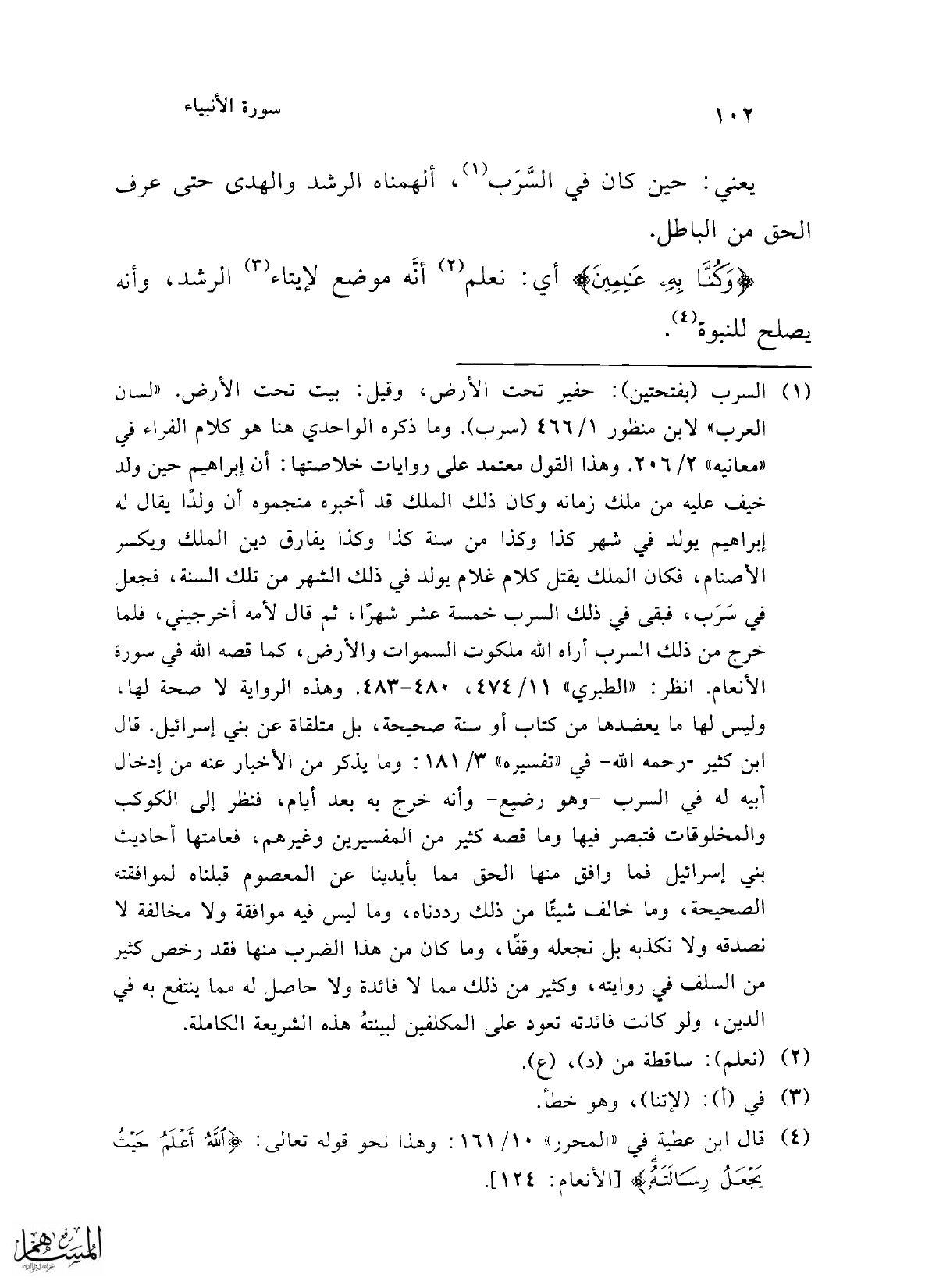 (¬1) السرب (بفتحتين): حفير تحت الأرض، وقيل: بيت تحت الأرض. "لسان العرب" لابن منظور 1/ 466 (سرب). وما ذكره الواحدي هنا هو كلام الفراء في "معانيه" 2/ 206. وهذا القول معتمد على روايات خلاصتها: أن إبراهيم حين ولد خيف عليه من ملك زمانه وكان ذلك الملك قد أخبره منجموه أن ولدًا يقال له إبراهيم يولد في شهر كذا وكذا من سنة كذا وكذا يفارق دين الملك ويكسر الأصنام، فكان الملك يقتل كل غلام يولد في ذلك الشهر من تلك السنة، فجعل في سَرَب، فبقى في ذلك السرب خمسة عشر شهرًا، ثم قال لأمه أخرجيني، فلما خرج من ذلك السرب أراه الله ملكوت السموات والأرض، كما قصه الله في سورة الأنعام. انظر: "الطبري" 11/ 474، 480 - 483. وهذه الرواية لا صحة لها، وليس لها ما يعضدها من كتاب أو سنة صحيحة، بل متلقاة عن بني إسرائيل. قال ابن كثير -رحمه الله- في "تفسيره" 3/ 181: وما يذكر من الأخبار عنه من إدخال أبيه له في السرب -وهو رضيع- وأنه خرج به بعد أيام، فنظر إلى الكوكب والمخلوقات فتبصر فيها وما قصه كثير من المفسيرين وغيرهم، فعامتها أحاديث بني إسرائيل فما وافق منها الحق مما بأيدينا عن المعصوم قبلناه لموافقته الصحيحة وما خالف شيئًا من ذلك رددناه، وما ليس فيه موافقة ولا مخالفة لا نصدقه ولا نكذبه بل نجعله وقفًا، وما كان من هذا الضرب منها فقد رخص في من السلف في روايته، وكثير من ذلك مما لا فائدة ولا حاصل له مما ينتفع به في الدين، ولو كانت فائدته تعود على المكلفين لبينتهُ هذه الشريعة الكاملة.