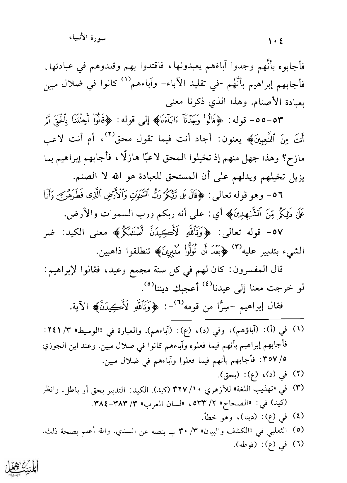 53 - 55 - قوله: {قَالُوا وَجَدْنَا آبَاءَنَا} إلى قوله: {قَالُوا أَجِئْتَنَا بِالْحَقِّ أَمْ أَنْتَ مِنَ اللَّاعِبِينَ} يعنون: أجاد أنت فيما تقول محق (¬2)، أم أنت لاعب مازح؟ وهذا جهل منهم إذ تخيلوا المحق لاعبًا هازلاً، فأجابهم إبراهيم بما يزيل تخيلهم ويدلهم على أن المستحق للعبادة هو الله لا الصنم.
