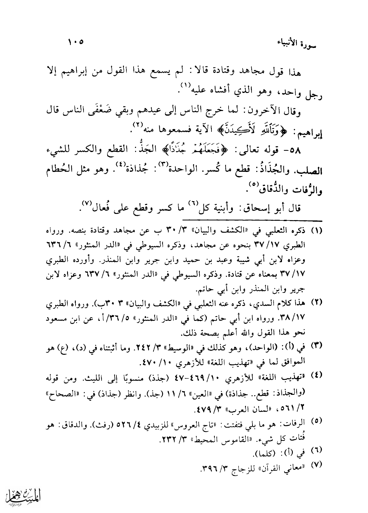 58 - قوله تعالى: {فَجَعَلَهُمْ جُذَاذًا} الجَذُّ: القطع والكسر للشيء الصلب. والجُذَاذُ: قطع ما كُسر. الواحدة (¬3): جُذاذة (¬4). وهو مثل الحُطام والرُّفات والدُّقاق (¬5).