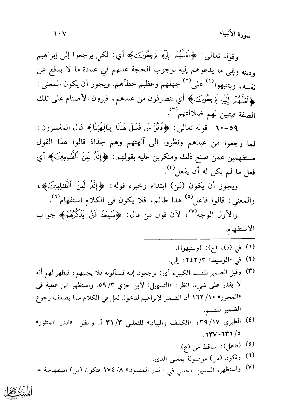 (¬3) وقيل الضمير للصنم الكبير، أي: يرجعون إليه فيسألونه فلا يجيبهم، فيظهر لهم أنه لا يقدر على شيء. انظر: "التسهيل" لابن جزي 3/ 59. واستظهر ابن عطية في "المحرر" 10/ 162 أن الضمير لإبراهيم لدخول لعل في الكلام مما يضعف رجوع الضمير للصنم.