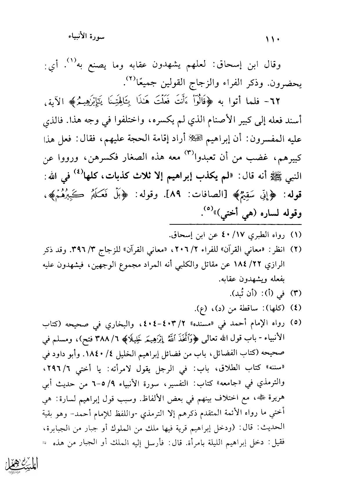 (¬5) رواه الإمام أحمد في "مسنده" 2/ 403 - 404، والبخاري في صحيحه (كتاب الأنبياء - باب قول الله تعالى {وَاتَّخَذَ اللَّهُ إِبْرَاهِيمَ خَلِيلًا} 6/ 388 فتح)، ومسلم في صحيحه (كتاب الفضائل، باب من فضائل إبراهيم الخليل 4/ 1840. وأبو داود في "سننه" كتاب الطلاق، باب: في الرجل يقول لامرأته: يا أختي 6/ 296 , والترمذي في "جامعه" كتاب: التفسير، سورة الأنبياء 9/ 5 - 6 من حديث أبي هريرة -رضي الله عنه-، مع اختلاف بينهم في بعض الألفاظ. وسبب قول إبراهيم لسارة: هي أختي ما رواه الأئمة المتقدم ذكرهم إلا الترمذي -واللفظ للإمام أحمد- وهو بقية الحديث: قال: (ودخل إبراهيم قرية فيها ملك من الملوك أو جبار من الجبابرة، فقيل: دخل إبراهيم الليلة بامرأة. قال: فأرسل إليه الملك أو الجبار من هذه =