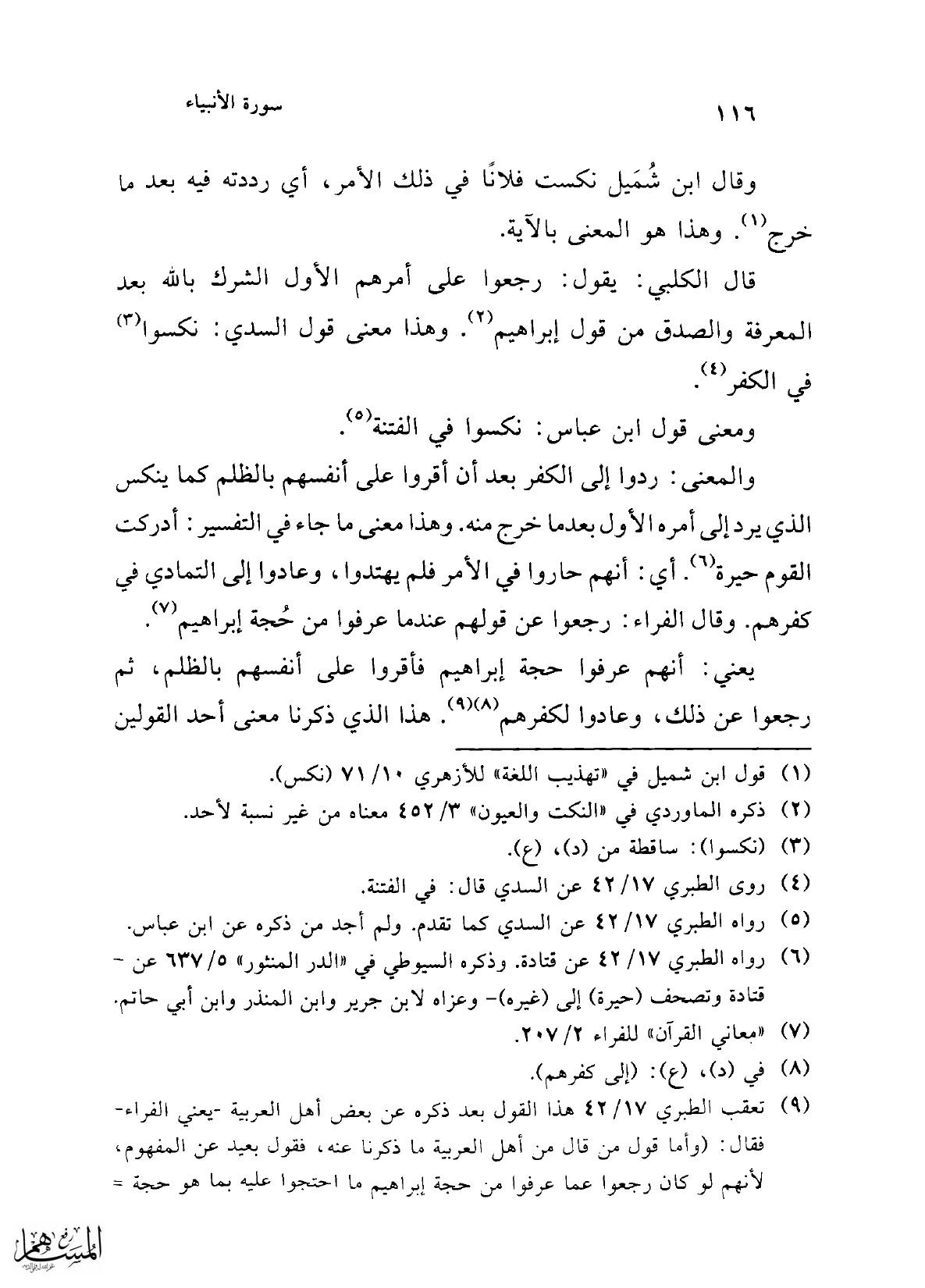 (¬9) تعقب الطبري 17/ 42 هذا القول بعد ذكره عن بعض أهل الحربية -يعني الفراء- فقال: (وأما قول من قال من أهل العربية ما ذكرنا عنه، فقول بعيد عن المفهوم، لأنهم لو كان رجعوا عما عرفوا من حجة إبراهيم ما احتجوا عليه بما هو حجة =