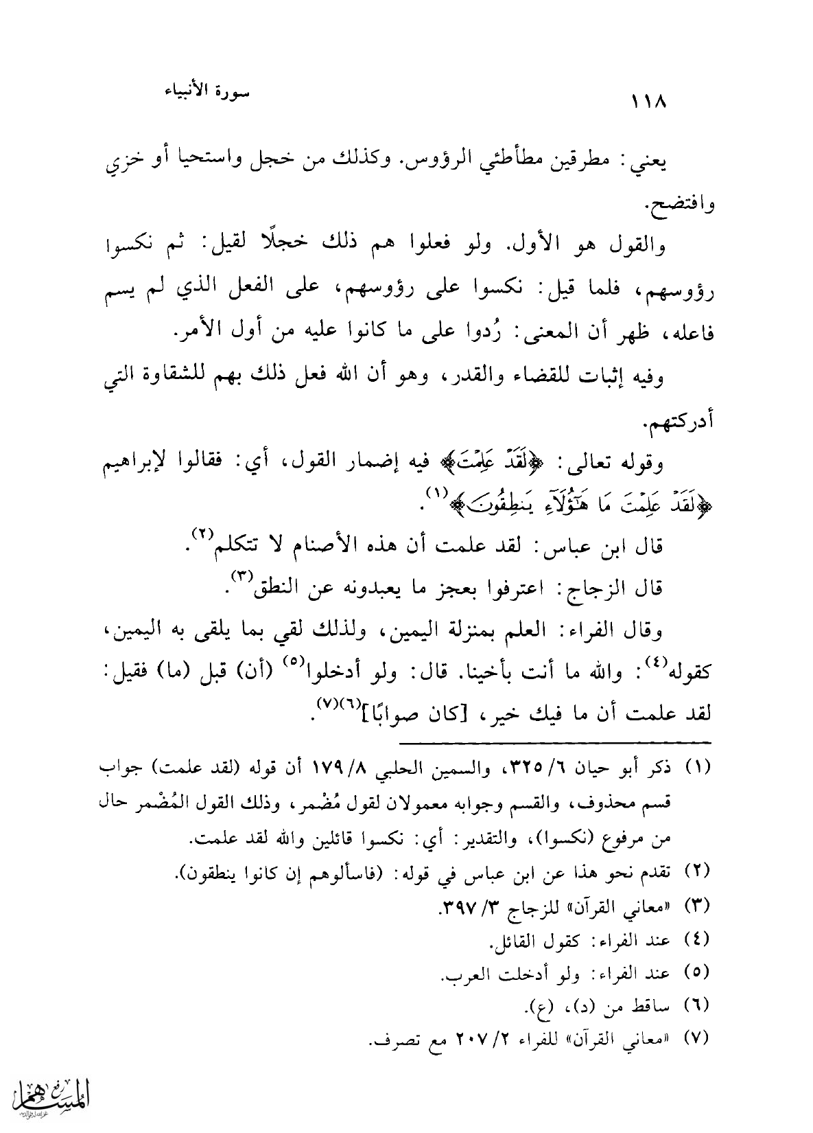 (¬1) ذكر أبو حيان 6/ 325، والسمن الحلبي 8/ 179 أن قوله (لقد علمت) جواب قسم محذوف، والقسم وجوابه معمولان لقول مُضْمر، وذلك القول المُضْمر حال من مرفوع (نكسوا)، والتقدير: أي: نكسوا قائلين والله لقد علمت.