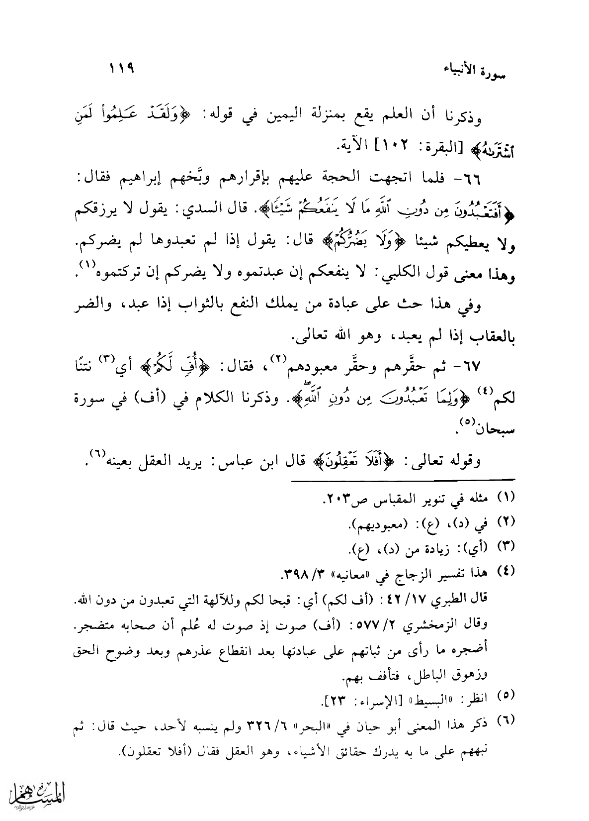 66 - فلما اتجهت الحجة عليهم بإقرارهم وبَّخهم إبراهيم فقال: {أَفَتَعْبُدُونَ مِنْ دُونِ اللهِ مَا لَا يَنْفَعُكُمْ شَيْئًا}. قال السدي: يقول لا يرزقكم ولا يعطيكم شيئاً {وَلَا يَضُرُّكُمْ} قال: يقول إذا لم تعبدوها لم يضركم. وهذا معنى قول الكلبي: لا ينفعكم إن عبدتموه ولا يضركم إن تركتموه (¬1).