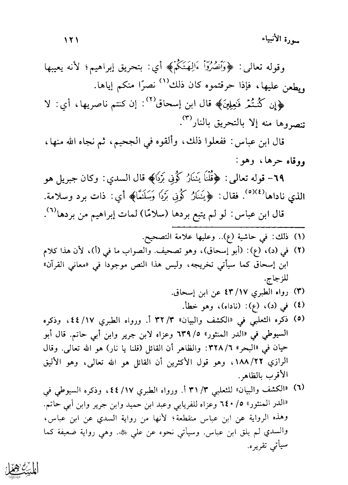 (¬5) ذكره الثعلبي في "الكشف والبيان" 3/ 32 أ. ورواه الطبري 17/ 44، وذكره السيوطي في "الدر المنثور" 5/ 639 وعزاه لابن جرير وابن أبي حاتم. قال أبو حيان في "البحر" 6/ 328: والظاهر أن القائل (قلنا يا نار) هو الله تعالى. وقال الرازي 22/ 188، وهو قول الأكثرين أن القائل هو الله تعالى، وهو الأليق الأقرب بالظاهر.