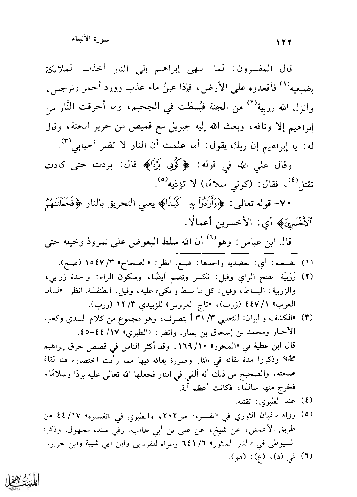 وقال علي -رضي الله عنه- في قوله: {كُونِي بَرْدًا} قال: بردت حتى كادت تقتل (¬4)، فقال: (كوني سلامًا) لا تؤذيه (¬5).