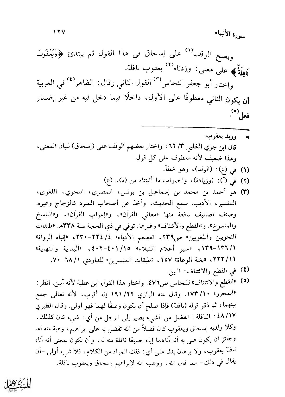 (¬5) "القطع والائتناف" للنحاس ص 476. واختار هذا القول ابن عطية لأنه أبين. انظر: "المحرر" 10/ 173. وقال عنه الرازي 22/ 191 إنه أقرب، لأنه تعالى جمع بينهما، ثم ذكر قوله (نافلة) فإذا صلح أن يكون وصفًا لهما فهو أولى. وقال الطبري 17/ 48: النافلة: الفضل من الشيء يصير إلى الرجل من أي: شيء كان كذلك، وكلا ولديه إسحاق ويعقوب كان فضلاً من الله تفضل به على إبراهيم، وهبة منه له. وجائز أن يكون عني به أنه آتاهما إياه جميعًا نافلة منه له، وأن يكون بمعنى أنه آتاه نافلة يعقوب، ولا برهان يدل على أي: ذلك المراد من الكلام، فلا شيء أولى -أن يقال في ذلك- مما قال الله: ووهب الله لإبراهيم إسحاق ويعقوب نافلة.
