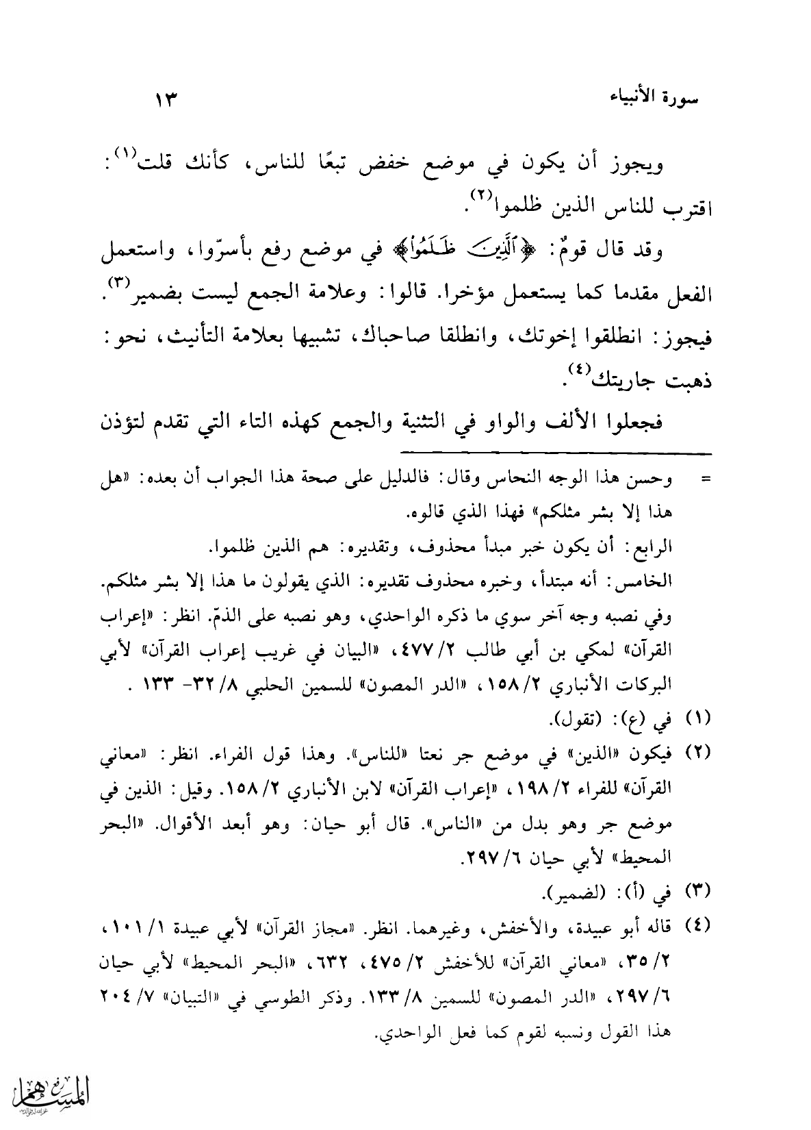 الخامس: أنه مبتدأ، وخبره محذوف تقديره: الذي يقولون ما هذا إلا بشر مثلكم. وفي نصبه وجه آخر سوي ما ذكره الواحدي، وهو نصبه على الذمّ. انظر: "إعراب القرآن" لمكي بن أبي طالب 2/ 477، "البيان في غريب إعراب القرآن" لأبي البركات الأنباري 2/ 158، "الدر المصون" للسمين الحلبي 8/ 32 - 133.